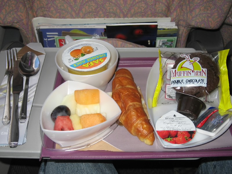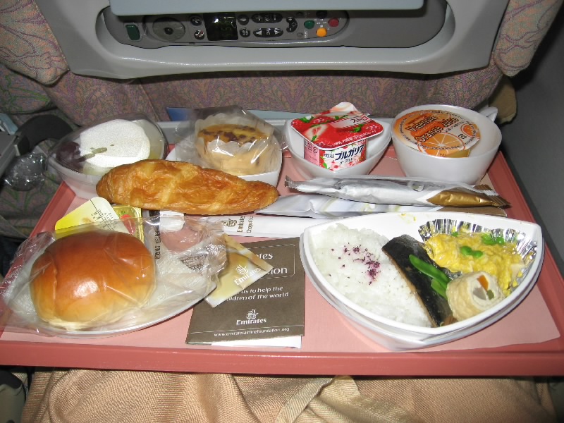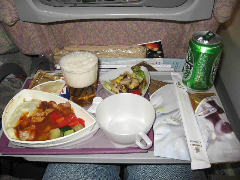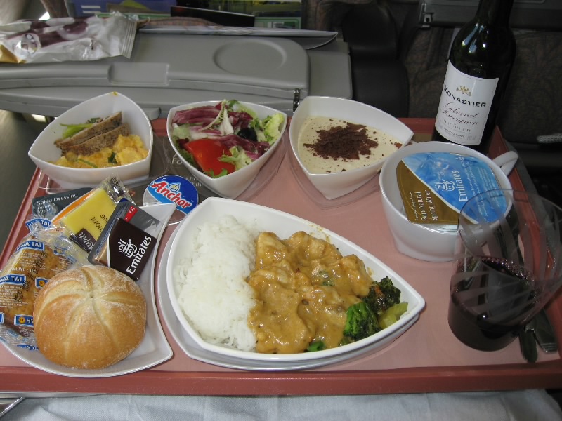 その後、すぐにいい匂いが漂ってきた。お昼ごはんだ。なんだか食べてばっかりだな。ここはタイカレーとサーモンの選択だが、スパイシー系が食べたいのでタイカレーにしましょう。さっきの白ワインに赤ワインを追加し、子牛の冷製にサラダを楽しむ。このサラダのドレッシングがヨーグルト風味でうまいのだ。続いてタイカレー。辛くてスパイシーでなかなかおいしい。いいぞ。あとはパンやチーズ、クラッカーといったところを楽しむのだが、エミレーツは片付けにくるまで時間があるのでゆっくり食べられる。コーヒーにデザートまで食べ、さすがに満腹。満足です。