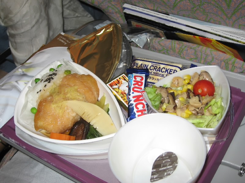 離陸してしばらくすると軽食タイム。時間が遅いので、ドリンクがあって機内食、というのではなくまとめて軽食。その軽食だが、洋食と和食で選択できるし、これがなかなかのもの。洋食はチキンがメインなのだが、付け合わせの野菜やマッシュポテトもおいしい。和食は揚げカレイの黒酢かけ、とういことでこれもなかなか。それぞれビールと日本酒でご機嫌にいただく。チーズとクラッカーもあり、デザートにはチョコ。コーヒーで締め、完璧だ。