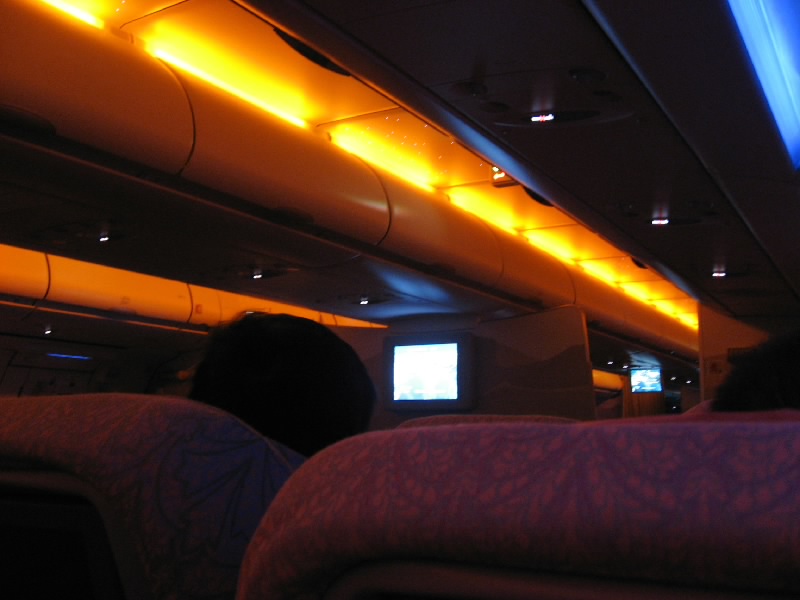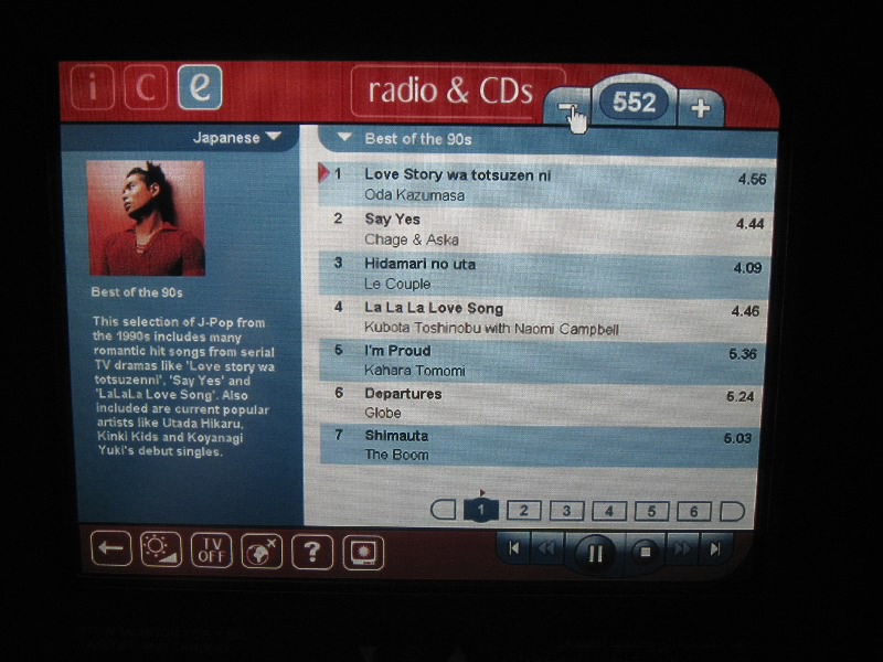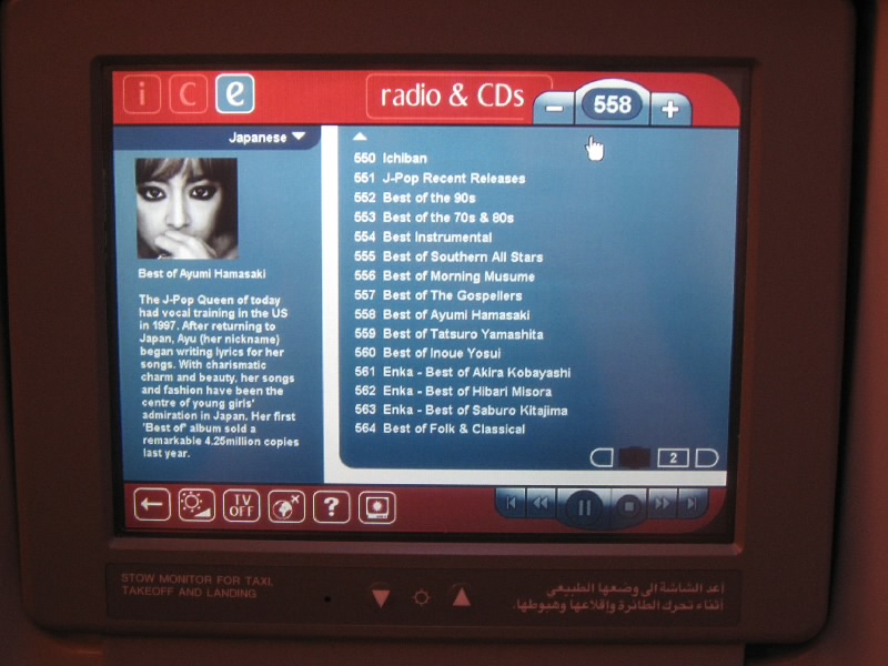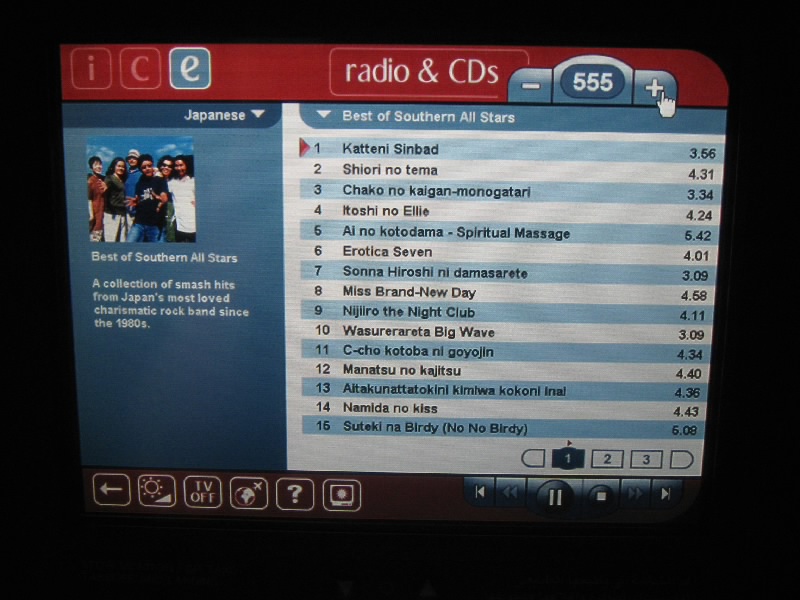 食後は音楽メニューを楽しむ。アーティストごとのベストや名作アルバムなど、日本のものはサザン、浜崎あゆみ、モーニング娘などのベストや各年代のベストヒット、最新ヒットソングなど。洋楽はビートルズやマドンナ、ABBAなど全部で100以上のチャンネルがある。一体どれから聞けばいいのだろう・・・贅沢な悩みだ。まあとりあえずは、日本の70年代80年代集を聞きながらのんびり過ごす。途中寝てしまっても、好きなところから始められるので聞きそびれることもない。これはいいなあ。他の航空会社もこんな風にすればいいのに・・・日本時間でちょうど夜ということもあり、それなりに寝ることもできたのであっという間に時間はたつ。