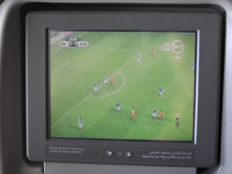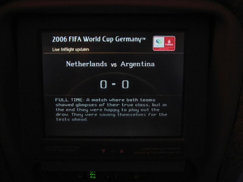さらにはエミレーツがワールドカップのオフィシャルスポンサーということで、試合結果の速報や前日の試合まで流すのだ。ということで、昨日のドイツ-エクアドル、ポーランド-コスタリカが国際映像でそのまま見られる。本当は今まさに行われているオランダ-アルゼンチンなどが見られれば最高なのだが、さすがにそこまでは無理か。いずれにしても、ここまでいろんなプログラムがあると、機内で退屈することはないだろう。あまりのことにめずらしく離陸するまでまったく眠くならなかった。最近の睡眠不足と、今日の疲れで絶対爆睡すると思っていたのだが・・・