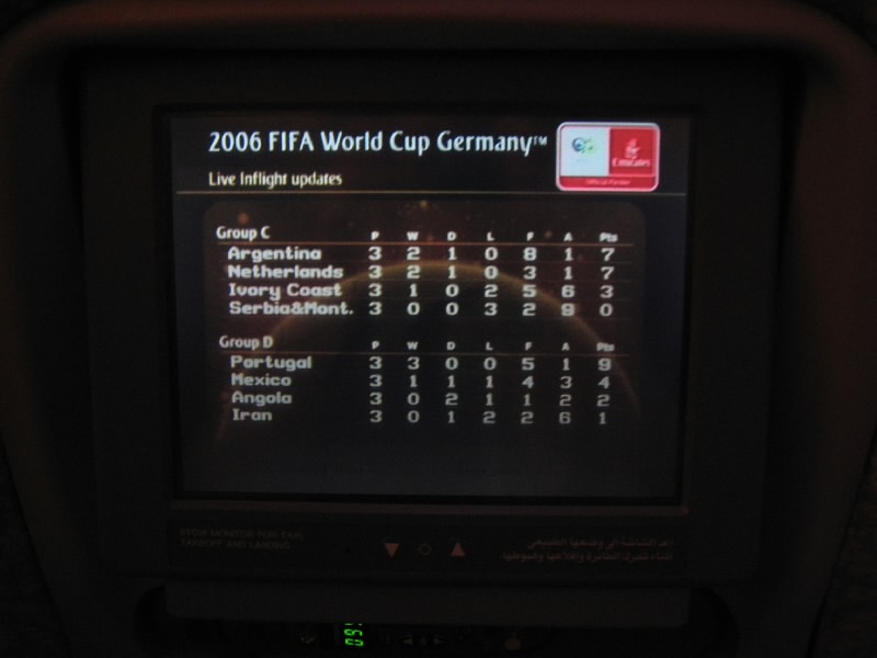 飛行機は中国からインド、そしてパキスタンを通る。画面には、終わったばかりのC組の結果が表示された。オランダ-アルゼンチンは引き分け、コートジボワール-セルビアモンテネグロはコートジボワールの逆転勝ち。こんな結果が速報で分かるのもいい。勝ち点の一覧も表示され、結局死のC組は1位アルゼンチン、2位オランダと順当な結果に終わった。到着2時間前となり、機内が明るくなった。照明が星空から朝焼けをイメージしたものとなり、朝ごはんタイム。