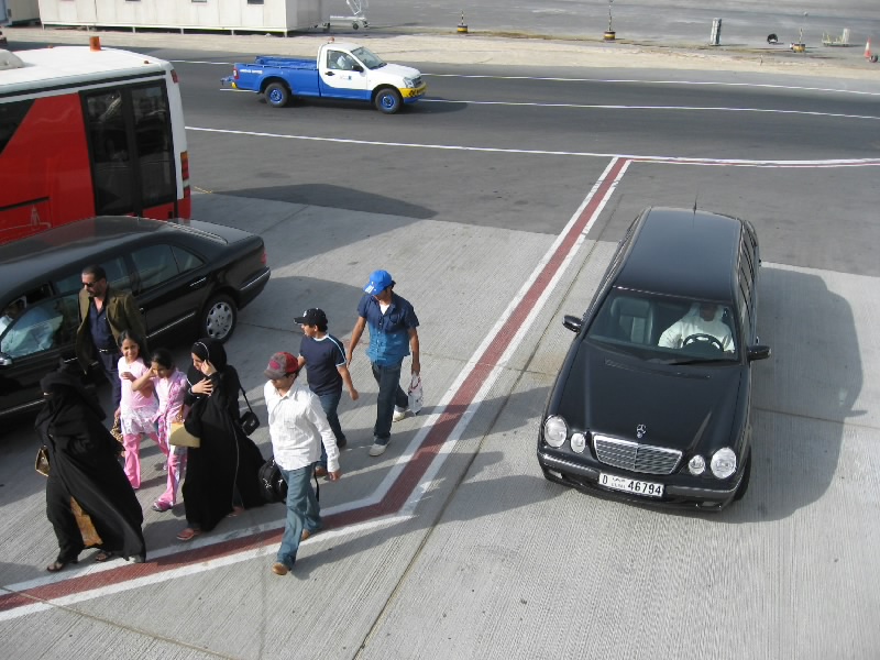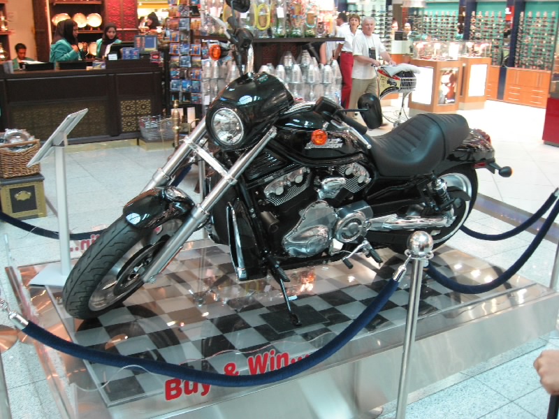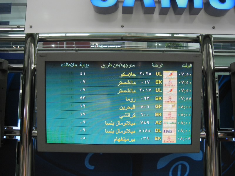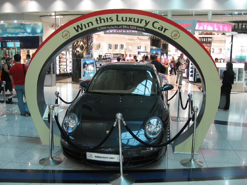 スーパーのように巨大な免税店には特別変わったものはないが、ドバイのお土産エリアで目を引くのはデーツ。なつめやしだ。これをジャムにしたり、チョココーティングしたり、アーモンドとともに干していたり。まあ、これは日本人的には好みの分かれるお土産になるだろうな。あとはドバイ名物、豪華抽選。免税エリアの中心に、ポルシェとハーレーダビッドソンがあり、免税店で買い物をすると何万人かに一人はあたるらしい。現実問題として当たったらどうする、とも思うがすごい話だ。さて、ゲートの表示を見るが、デュッセルドルフ行きはまだでていない。朝早い便がもう少し出発してくれないと出てこないのだ。同じ時間にでるバーレーン行きまで表示されているので、もうまもなく出るとは思うのだが・・・とはいえそろそろゲートに行きたいので、インフォメーションで確認。教えてもらった36番ゲートは、なんだか妙に遠く、着いたのは搭乗予定時刻である7時45分の少し前。聞いてよかった。