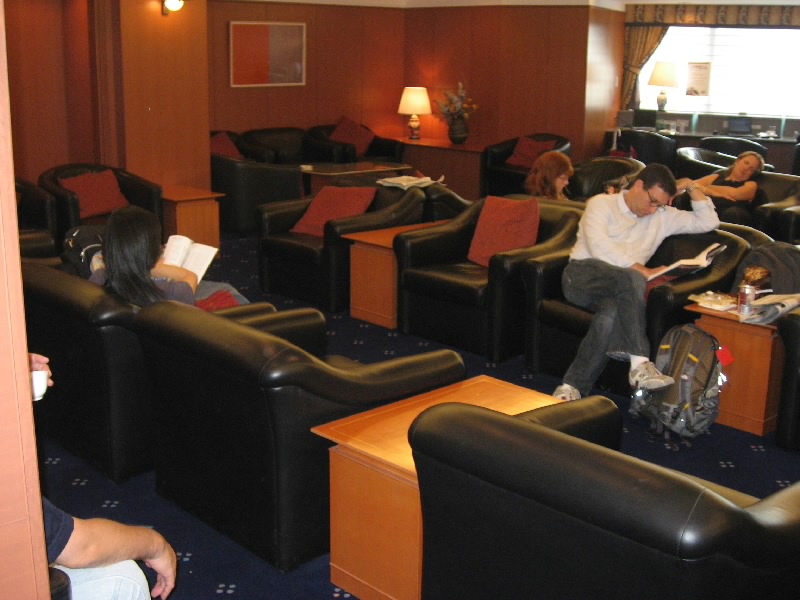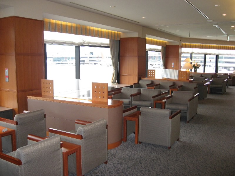 ここにもファーストクラスラウンジがあるので、いってみましょう。メインビルだけにさらに広くて席も多く、ビジネスコーナーも充実している。ビジネスクラスラウンジにはたくさんの人がいるぞ。それにしても、ビジネスクラスに乗る人ってこんなに多いんだねえ。でも我々はその奥にある、禁断のファーストクラスラウンジ。やっぱりこっちは革張りソファーでゆったりしている。ここには常に担当のおば、いやおねえさんがいて、飲み物や軽食など、常に気を使っている。お酒ばっかり飲んでもよくないので、ここはトマトジュースですっきりしましょう。おつまみもあるが、ここではもういいかな。しばらくのんびりと、ファーストクラスラウンジライフを楽しむ。