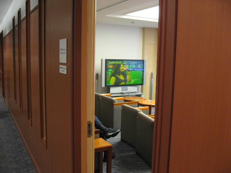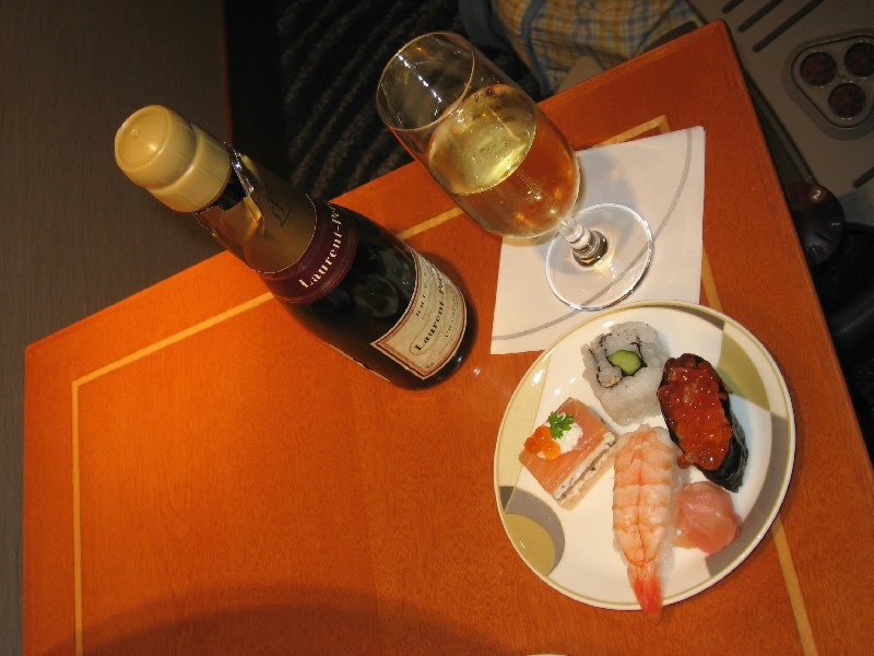 中に入ると、ゆったりした布張りのソファーが並んでいる。おねえさんに案内されるまま進むと、奥には仕切られた空間があり、そこにはさらにゆったりした革張りのソファーが並んでいた。なんとビジネスクラス用ラウンジの奥に、ファーストクラス用ラウンジがあったのだ。ざっと20席くらいあるようだが、半分くらいは埋まっている。この人たちは大会社の社長とか、セレブな人たちなのかな・・・なに、こっちは12万マイルの努力があってのこと、憶することは何もない。中にはビジュアルルームという仕切られた部屋があり、大きな液晶テレビではちょうどメジャーリーグのオールスターをやっている。おねえさんが飲み物を聞いてきてくれたので、こういう場所ではまずシャンパンでしょう。しばらくすると、グラスに注がれたシャンパンが小さなボトルとおつまみのチーズとクラッカーとともに運ばれてきた。まずはこれから始まる空の旅に乾杯だ。あとはセルフでお寿司をいただいたりしながらしばしくつろぐ。テレビではちょうどイチローが打席に。すでに2安打を打っているイチローだが、第三打席はなんとメジャーのオールスター史上初のランニングホームラン。やってくれるねえ。1時間ほど寛いだところで、出発ゲートのあるメインビルに戻る。