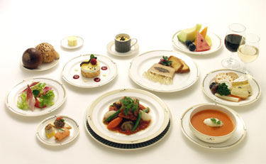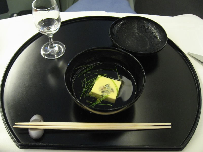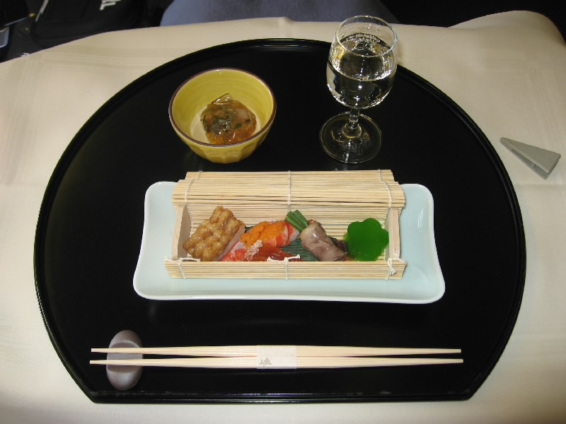 高度を上げ、水平飛行に入った。ここでウェルカムシャンパンが振る舞われる。まずは空の旅に乾杯だ。その後ワインリストが配られた。シャンパン2種にワインが赤白各4種、日本酒と焼酎も各2種あり、それにカクテルが多数ある。どうしようかと思ったが、やっぱりここはファーストクラスでしか飲めないシャンパンを頂きましょう。「Champagne Taittinger Comtes de Champagne 1995」と「Champagne Pol Roger Brut Chardonnay 1998」をお願いする。Taittinger(テタンジェ)は少しスコッチキャラメルの風味が感じられ、Pol Roger(ポルロジェ)はシャルドネらしいシャープですっきりとしたな味わい。どちらもいいシャンパンという感じがして、アミューズとともにおいしくいただく。いやあリッチな気分だ。そして次に、機内食のメニューが配られる。事前に和食をリクエストしていたのだが、別にこの場で変更してもいいらしい。でも日本の航空会社、まずは和食で。