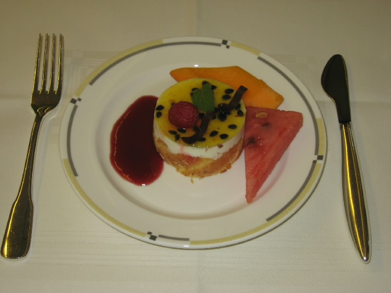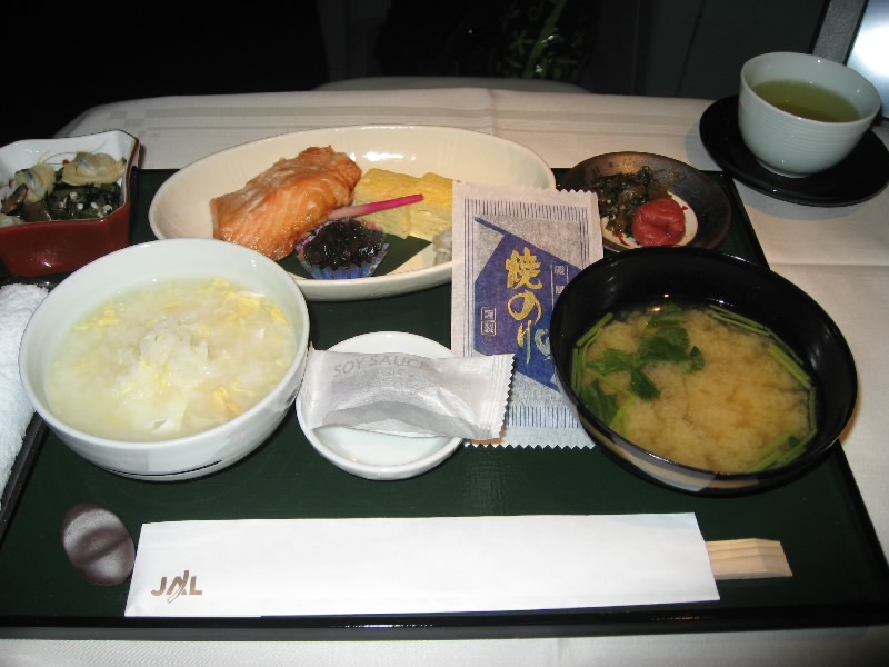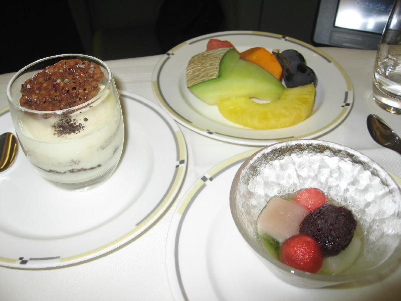 飛行機の中でウニやらすっぽんやら刺身やらを食べるのは初めてだ。当然ながら、うまい。最近のJALエコノミークラスの機内食はかなりひどいものだが、ファーストクラスはさすが。9人限定だし、かなりのお金を払っている人たちだし(マイラーを除く)、ここはなかなか手が抜けないところだろう。自分のペースでゆっくり食べられるのもいい。おかわりの日本酒は、佐賀の「東一」。ワイン樽で熟成させたとのことで、すこし樽香のあるお酒。これは・・・好みとしては少し微妙。日本酒は米の香りでもっとすっきりしているほうが好みかな・・・これはこれで美味しいけどね。しめのごはんは機内での炊きたてコシヒカリらしい。おかずがおいしいのはもちろんいいが、おいしいごはんでしめるというのは実にいい。食後のデザートはワゴンでのサービス。果物やケーキ、チーズなど好きなものをいただける。ということで、全部で4種類いただきました。