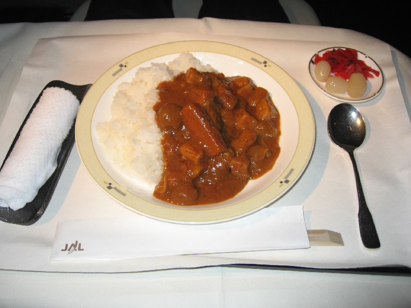 音楽を聴きながら、随分寝た気がする。なにやらいい匂いが漂っているが、これは誰かが軽食のラーメンでも食べているのだろうか。今どこだ?フライトマップを見ると、なんともうウラル山脈は越え、まもなくモスクワの辺り。ロシアを横断するほぼ6時間近く寝ていたことになる。やっぱり体を伸ばして羽根布団に包まれると、普通にぐっすり眠れてしまうのだ。こうしてしっかり眠れるのもいいが、やはりファーストクラスそのものをもっと楽しまないと。起きようと座席を起こし、ライトをつけて軽食メニューを見ていると、CAが「お目覚めですか、お布団お片づけしましょうか、なにかお持ちしましょうか。」と来たので、布団を片付けてもらって軽食のカレーをいただきましょう。さーちゃんも起きたようで、同じくカレーをいただく。しばらくして出てきたものは、ちゃんとしたお皿に入ったベジタブルカレー。ラッキョや福神漬けまで付いている。カレーは少し辛めで、野菜がしっかり入っていておいしい。このレベルならば、カレー屋さんでそのまま出せそうな気もするな。さて、フランクフルトまではあと4時間くらいだし、あとは映画でも見ながらのんびりしましょう。「東京タワー」は見たことないのでちょうどいい。MAGICVなので、いつでも最初から見られるし止められるので便利だ。椅子をゆったり倒してのんびりと過ごす。