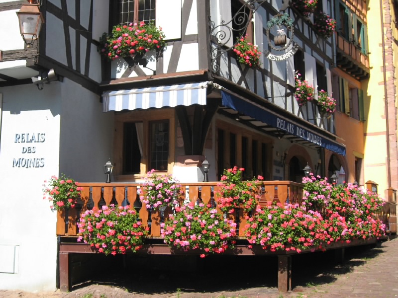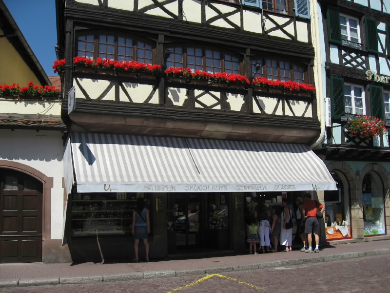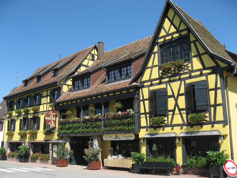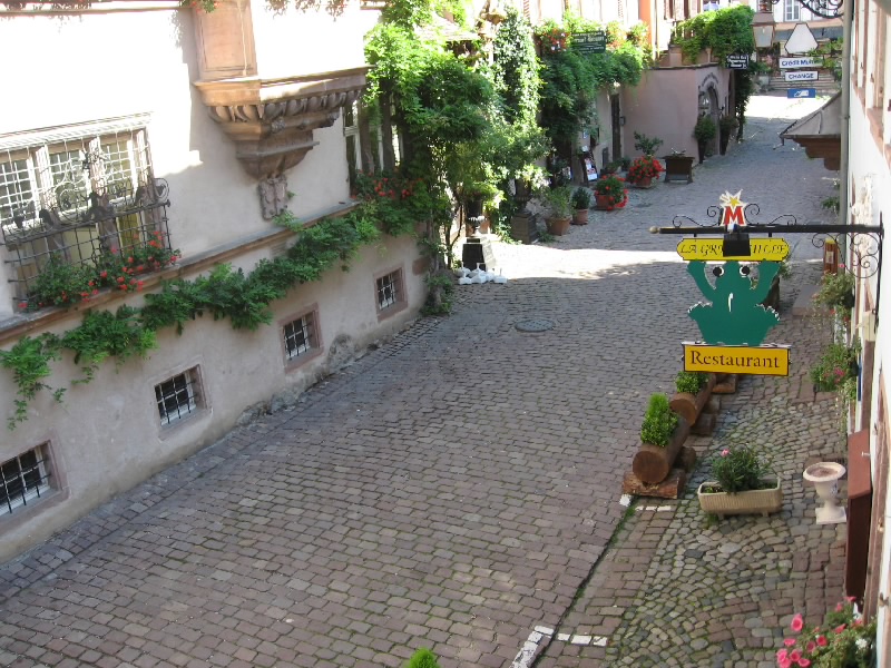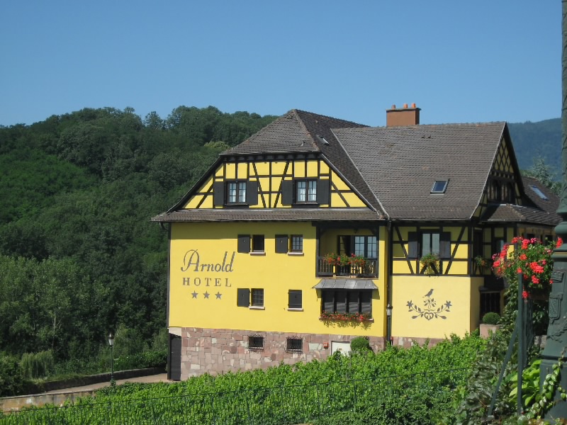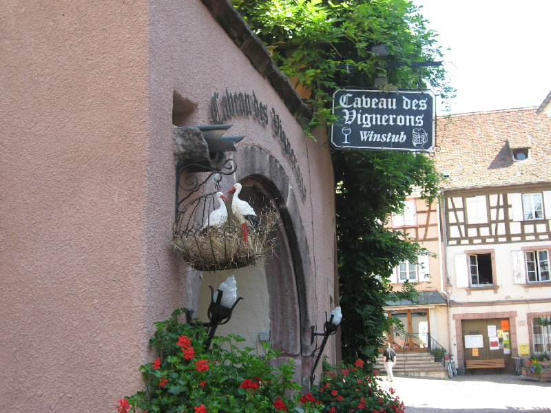 住宅街のような村もあれば、ぶどう畑とともに生活しているような村もある。どの村も、木組みのアルザス風の家がいい感じ。ダンバッハの村の近くには、グランクリュの看板を出したぶどう畑があった。そしてイタルスヴィレール(Itterswiller)に到着。少し小高い丘にあり、なんだかいい感じの村。野性の勘でよさそうなホテルもあるし、そのホテルのレストランもあるし。お店もあるのでちょっとよって行きましょうか。中に入るとフェルベールさんのジャムがあった。少し高めで、あまり種類はないけどね。アルザスものがいろいろあるので、せっかくなので何か買おう。やっぱりワインかな、というわけでグランクリュの白ワインを2本をゲット。一本はさっき通ったダンバッハのピノグリ、そしてもう一本はここイタルスヴィレールのリースリング。あとは陶器のガチョウの置物をゲット(34.3E)。フォアグラの元、だからね。さて、行きますか。