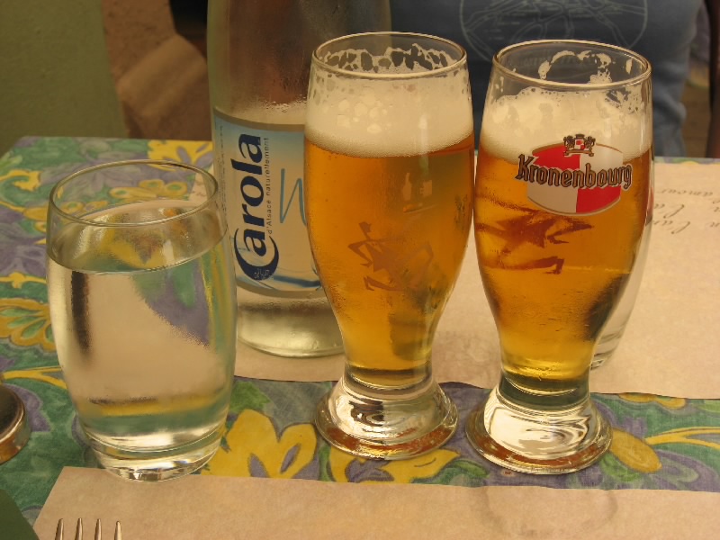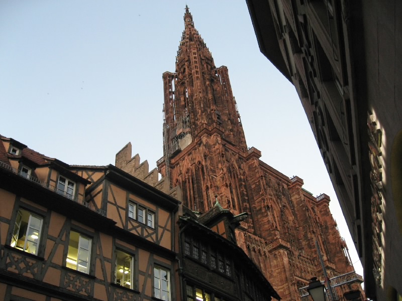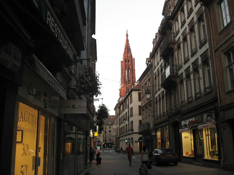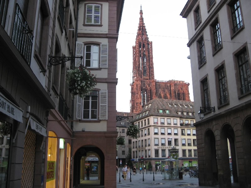 さて、そろそろ行きますか。外にでると、温度の表示がありなんと36度。暑いわけだ。この強い日差しでは、体感温度は40度を越えているかもね。車に戻り、ここでワイン街道の旅も終了だ。広い道に出て、ガソリンを補給(52.63E)。お店のお姉さんに聞きながら、なんとか間違えずに無鉛ガソリンを入れる。満タンになったのだが、リッター1.408ユーロ、約240円。日本の倍。高いなあ・・・一路ストラスブールを目指す。これまであれほど左右に広がっていたぶどう畑がなくなり、とうもろこし畑とキャベツ畑に変わった。何か少し寂しい気分になるね。でもドライブは快適だ。30分も走ると、ストラスブール中心街への出口まで来た。一般道に出て、あとはホテルまでもう少し。だかここからストラスブールの洗礼が始まる。地図を見て、とりあえず旧市街へ入ろうとプチットフランスの橋を渡ろうとすると侵入禁止。もう少し時計の逆回りに進み、橋を渡ろうとすると左折禁止。さらに越え、ようやく左折のできる橋を渡る。すると巨大な大聖堂の前に出てきたぞ。ゆっくり見てみたいが、まずはホテルに行かないと。で、この大聖堂は目の前の駐車場までで車は行き止まり。うーん、どう行けばいいのかな?橋を渡っていったん元の道に戻り、今度は旧市街を時計回りに進む。プチットフランス前の橋を越え、さらにぐるっと回るが旧市街に入れる道が無い。地図を見ながらしばらく行くと、ようやく旧市街に入れる橋を発見。しばらく進み、もう少し行けばホテルなのだが・・・今度は道の真ん中に柵が立っていた。これはもうわからん。ちょうど小さな駐車場がすぐそばにあったのでそこに車を停め、ホテルまで歩いていく。すぐにホテルに到着したので、ホテルの駐車場までの行き方を教えてもらう。するとどうやらさっきの柵を越えたところにある道を進めば、ホテルの前まで出るようだ。どっちにしても車で柵は越えられないので、どう行けばいいのかを歩いて確認。さてさて、どう行くのかな・・・歩いても歩いても、侵入禁止の嵐。結局いったん橋を渡って旧市街から出て、川沿いの道を時計と逆回りにぐるっと進み、2つめの橋で再び旧市街へと入る。そしてこれはどう?というような狭い道を進むと、ようやく教えてもらったホテルへと続く道へと出てきた。この通りもカフェが並んでいて運転しにくいけどね・・・まあいい。ようやく道がわかったので車に戻ると、なんとさっきの柵が無く、車が通っているではないか。どういうこと?しばらく見ていると、何やら柵の手前にあるインターフォンであけてほしいことを伝えたら、柵が降りるらしい。なんと、それは気づかなかった・・・ずいぶん暑い中を歩いてきたが、実は目の前に正しい道があったのだ。再び上がってしまった柵だが、インターフォンをおしてホテルメゾンルージュに行きたいと伝えると、少し間があって柵が降りた。なるほどね・・・一般の車は入れないが、目的地がある車はちゃんと通れるようになっているのだ。なるほどね・・・ようやくホテルに到着。きれいな涼しいロビーでほっと一息つき、部屋へと入る。うーん、部屋は暑いなあ、エアコンはどこだ、と思ったがどこを探してもエアコンのスイッチが無い。しかも天井を見ても、どこにも通風口がない。まさか、エアコンの無い部屋?この猛暑の中ではあまりにつらいし、明日は帰る日なのですっきり汗を流して帰りたい。ということでフロントに連絡し、エアコンのある部屋にチェンジ。どうやら予約そのものが、エアコンなしの部屋になっていたらしいが・・・そこまでちゃんと見ていなかったな。少し高くはなるが全然OKの範囲。向かいの部屋にチェンジしてもらうと、こちらは涼しく、部屋もバスルームも広い。やっぱりこうじゃないとねえ。これでようやく落ち着ける。涼しい部屋でしばらく休憩。