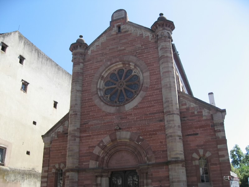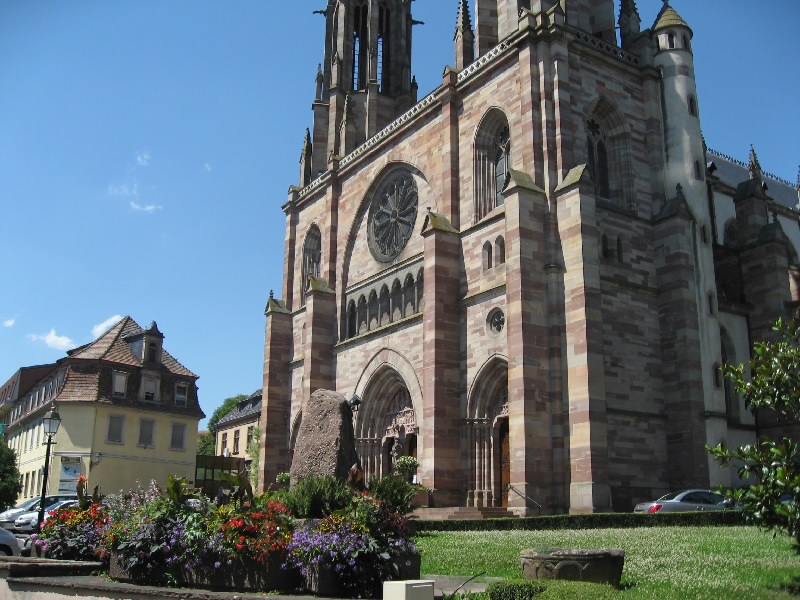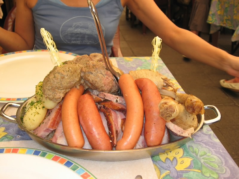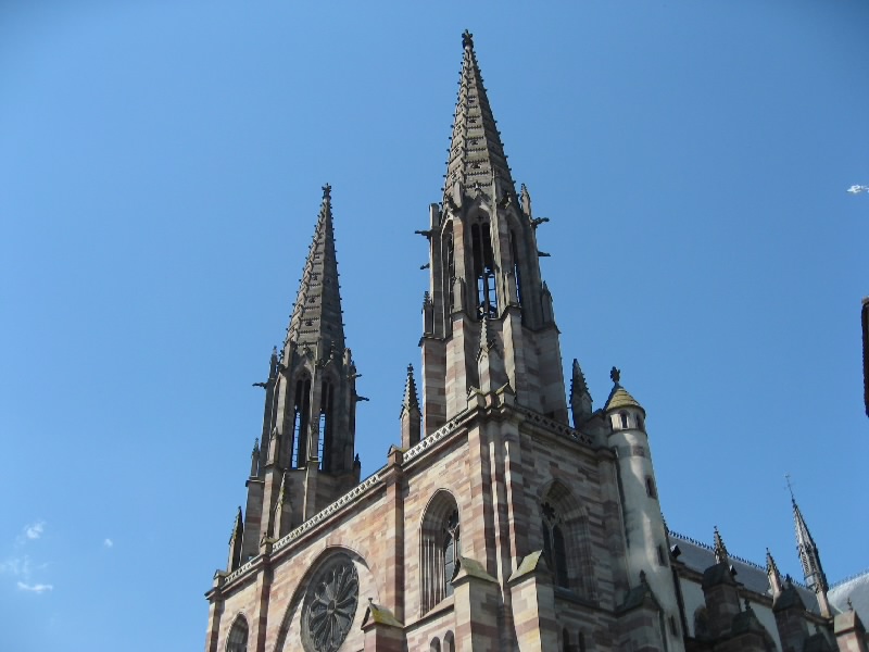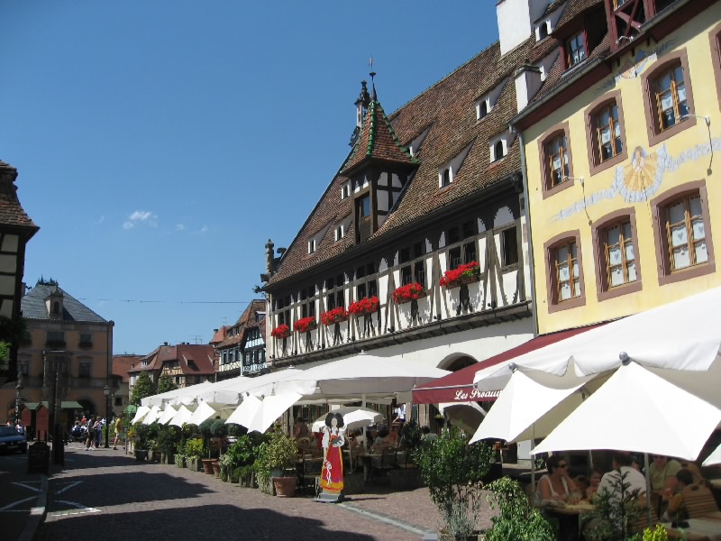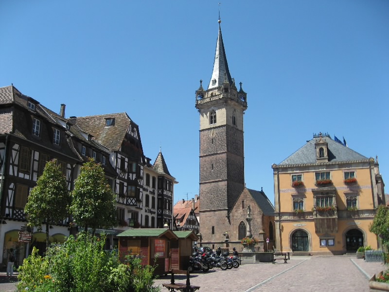アイヒホッフェン(Eichhoffen)−ミッテルベルグハイム(Mittelbergheim)を越え、バール(Barr)に到着。アルザスのパンフレットによると7月中旬にワイン祭りがあるとのことで来てみたのだが、人通りが無く特に何かをやっている様子はない。うーん、期待外れ。じゃあオベルネ(Obernai)に行きますか。ゲルトヴィレール(Gertwiller)−ゴックスヴィレール(Goxwiller)を過ぎ、標識に従って進むとすぐにオベルネ市街に入ってきた。ここは少し大きめの街かな。しばらく走ると教会の尖塔が見えてきた。あの辺が中心かなあと思い走っていると、人通りも多いにぎやかな通りを発見。このあたりだな。あとはPの表示に従って進み、街の中心に近い駐車場に停めることができた。よしよし。それでは街歩きに行きますか。まずは腹ごしらえ。おなかがかなり減ったので、再度シュークルートと勝負しますか。レストランが並んでいる通りがあったので、メニューを見ながらお店を選ぶ。普通のシュークルートというよりも、あえて最後の洗礼を受けようか。あるお店で、ロワイヤルで2人分というのがあったので、あえてのロワイヤルを選択。お店に入り、まずはビールで喉を潤す。さて、ロワイヤルとはどんなものがでてくるか。好奇心と一抹の不安を抱えながら待っていると、しばらくしてロワイヤル登場・・・なんだこれは。となりの老夫婦が目を丸くしている。大きな皿にソーセージやハム、ベーコン、鴨肉にレバー団子がてんこもり、そしてギャートルズに出て来るような肉の固まり。下にあるのはシュークルートなのだが、その上の肉系があまりにも大量なのだ。さあ、勢いで食べよう、と思うのだが、匂いにつられてか虫が多数よってくる。これを扇子で払いながら食べるので、余計な体力が必要だし食べる勢いもそがれる。それでもソーセージを食べ、ハムを食べ、ベーコンを食べ、レバー団子をたべ、鴨肉を食べ、ギャートルズ肉を分解して食べ、シュークルートを食べ、そしてビールを飲み、虫と格闘しながら食べ続ける。鴨とレバーが今ひとつではあったが、他はなかなかおいしい。ただこの量と、虫との戦いと、この暑さとでだんだんペースが落ちてきた。結果、かなり食べたつもりにはなっているものの、皿にまだまだ大量のシュークルートと若干の肉片を残した状態で終了。シュークルートとの聖戦は、あえなく惨敗に終わった。もったいないが・・・ギャル曽根なら一人で余裕の完食なんだろうな(50.6E)。