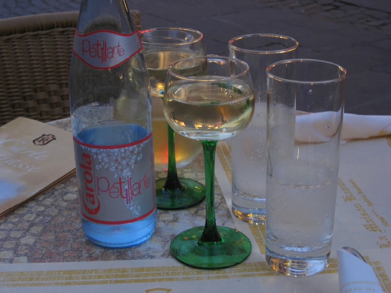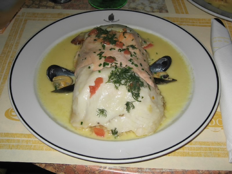 さて、ごはんをどうしますか。カテドラル広場前にある、Kammerzellいうレストランが昔のFIGAROに載っていたのだが、まだお茶している人も多いがにぎわっているし、気軽に入れそうだしここにしましょう。さて、最後のディナーとなるので昼に続いてシュークルートとの戦い第三弾、ストラスブール名物・魚のシュークルートにしましょう。まずはゲベルツをグラスで頂きながら、冷たい炭酸水でのどを潤す。さてさて、どんなものが出てくるかな・・・シュークルート登場。うん、昼間にものすごいものを見たせいか、少しきれいな盛りつけのせいか、それほどすさまじいものでは無いな。さて、いただきますか・・・おっと、なかなかうまい。白身とサーモン、あとは少し薫製にした白身、それが少しのクリームソースと絡まり、シュークルートとともに食べるとなかなかうまい。ゲベルツとの相性もいいしね。と思って食べたいたが、昼の強烈なものがまだ胃に残っているのか、途中で急にペースダウン。ということで魚はほぼいただいたが、シュークルートはあまり食べることができなかった。あと燻製が少ししょっぱかったかな。残念だが・・・ごちそうさまでした(58.8E)。