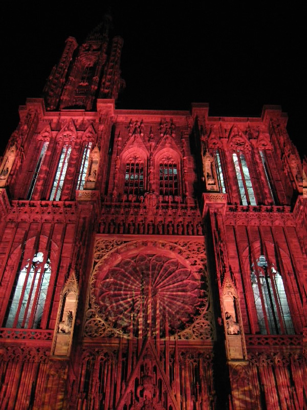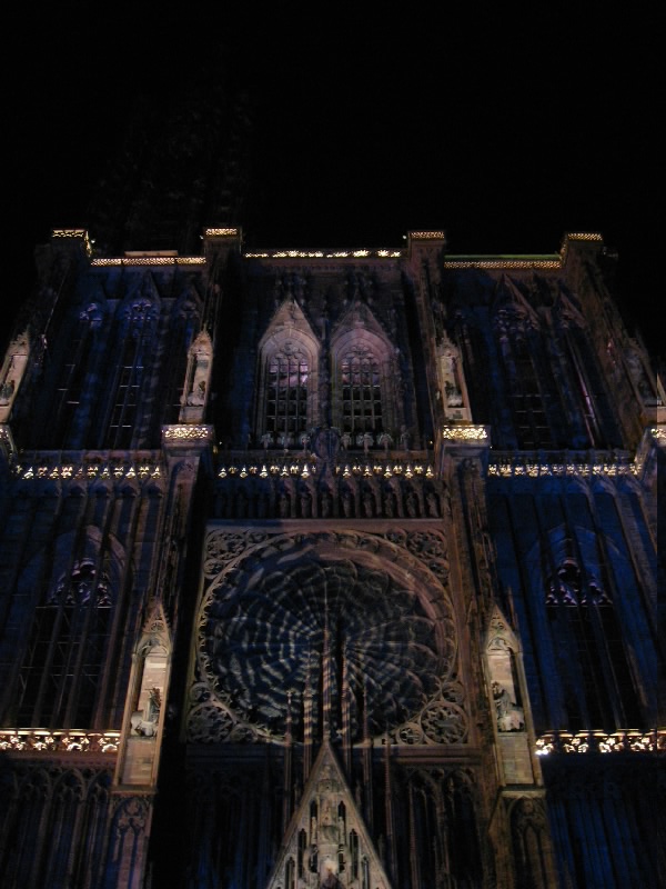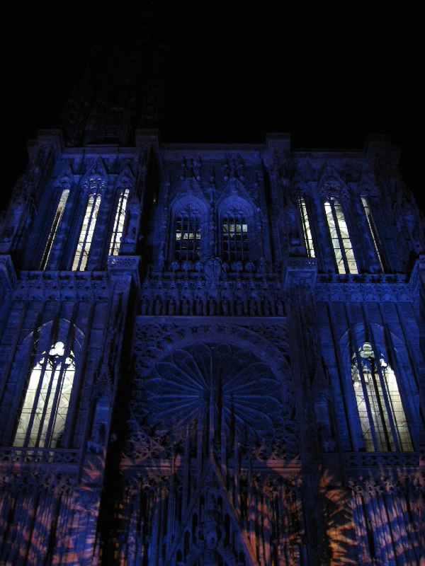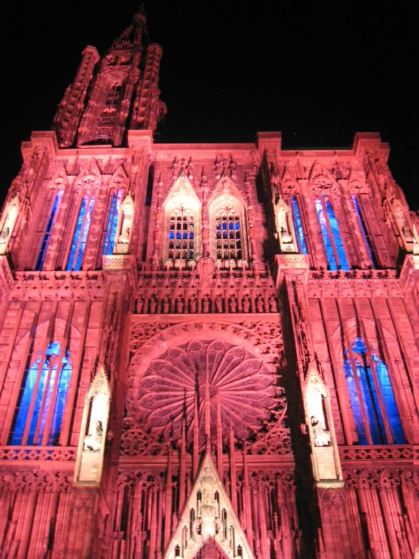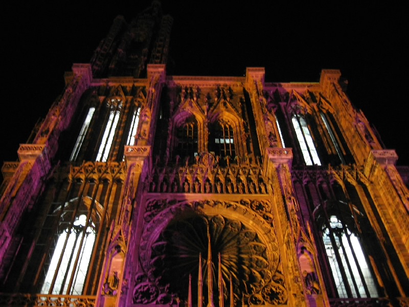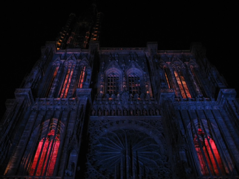 残りのワインをゆったりと楽しんでいると、なにやら突然周りが暗くなった。そして、音楽が流れ、この大聖堂のライトアップが始まった。そしてそのライトアップにより、大聖堂は黄、赤、紫、青、白と次々に表情をかえる。黄色は華やかで、赤は情熱的。紫は妖艶で、そして青はなにやら不気味な雰囲気を醸し出す。今いるテーブルからはちょうど大聖堂が見上げられることもあり、特等席だ。ただ大聖堂があまりに高すぎて、首が痛くなってくるけどね・・・そのショーが3度ほど行われる。観光客も入れ替わり次々と訪れるようで、夏のストラスブールの風物詩かもしれないな。さて、お店をでましょうか。今までは斜めから見上げるアングルだったので、今度はカテドラルの正面に行きましょう。再びショーが始まり、大聖堂はライトアップにより7色に表情を変える。華やかだったり情熱的だったり、妖艶だったり不気味だったり。カテドラルの内部もライトアップされており、その色の組み合わせでこれほど印象は変わるんだね。なかなか面白いひと時でした。