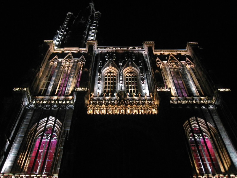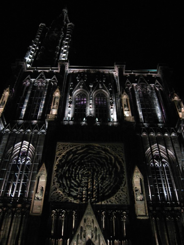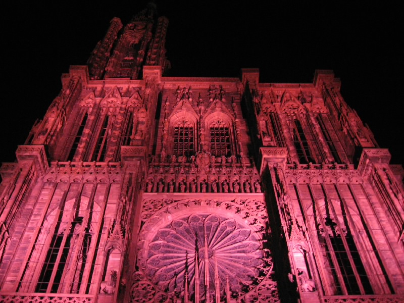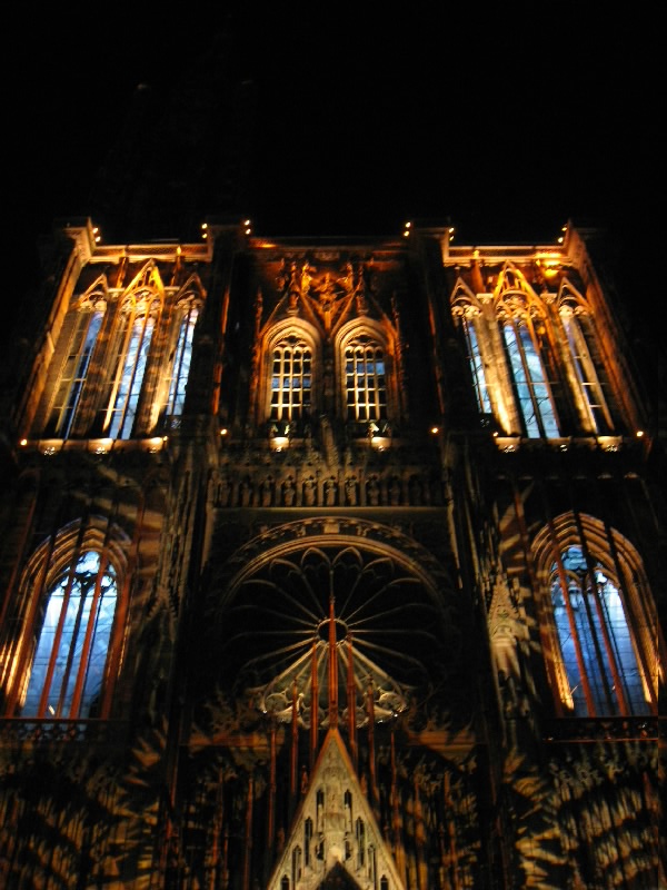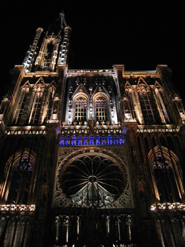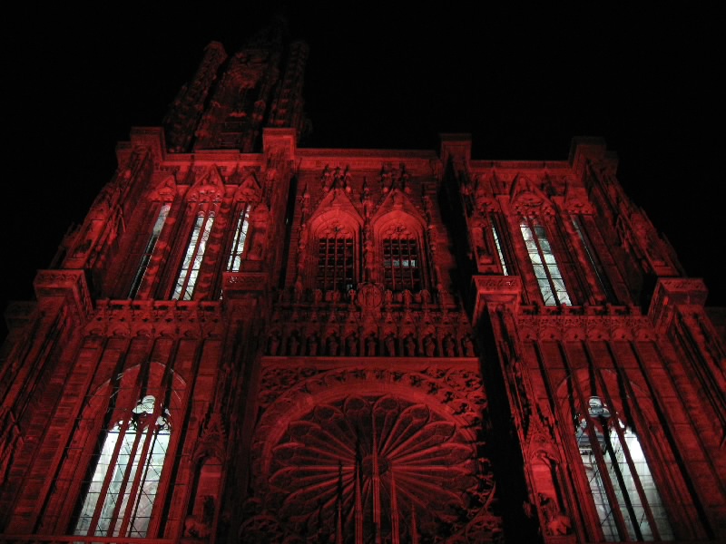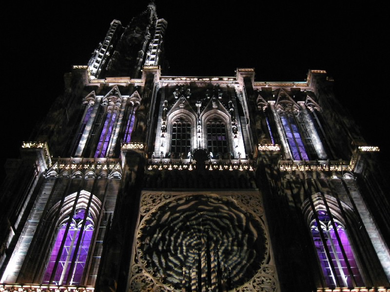 残りのワインをゆったりと楽しんでいると、なにやら突然周りが暗くなった。そして、音楽が流れ、この大聖堂のライトアップが始まった。そしてそのライトアップにより、大聖堂は黄、赤、紫、青、白と次々に表情をかえる。黄色は華やかで、赤は情熱的。紫は妖艶で、そして青はなにやら不気味な雰囲気を醸し出す。今いるテーブルからはちょうど大聖堂が見上げられることもあり、特等席だ。ただ大聖堂があまりに高すぎて、首が痛くなってくるけどね・・・そのショーが3度ほど行われる。観光客も入れ替わり次々と訪れるようで、夏のストラスブールの風物詩かもしれないな。さて、お店をでましょうか。今までは斜めから見上げるアングルだったので、今度はカテドラルの正面に行きましょう。再びショーが始まり、大聖堂はライトアップにより7色に表情を変える。華やかだったり情熱的だったり、妖艶だったり不気味だったり。カテドラルの内部もライトアップされており、その色の組み合わせでこれほど印象は変わるんだね。なかなか面白いひと時でした。