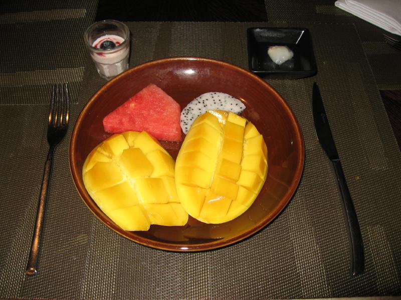 7時起床。目覚ましかけずにゆっくりと寝られて気持ちがいい。朝日が部屋に差し込んでいるぞ。今日はいい天気になりそうだな。外を見ると、もう泳いでいる人がいる。シャワーを気持ちよく浴び、さっぱりしたところで9時頃に朝ごはんへ。4階のレストランに行き、中に入るとデザートや果物、パンがたくさん置いてあった。なかなかすごいなあ。でも温かいものは?ぐるっとまわってもないな、と思ったら奥にも部屋があってそこに温かいものシリーズ。オムレツや麺もその場で作ってくれる。さらには飲茶、カレー、お粥などもある。そしてその反対側にはサラダコーナーが。日本の蕎麦もあるぞ。さてどうしようか・・・やっぱりカレーが魅力的なので、カレーメインでいろいろ取ろう。飲茶も忘れずにね。あと絞りたてのオレンジジュースを頂き、まず第一回目の皿が完成。うん、どれもおいしいぞ。このホテルは朝ごはんが充実していると言われているだけあって、これはすごいなあ。第二回目の皿は、サラダ中心で行きましょうか。たっぷり生野菜を食べないとね。そして第三回目の皿は、果物でフィニッシュ。かごにあるものを選ぶこともできるのだが、なんとマンゴーもその場で切ってくれる。少し酸味のある、おいしいマンゴーを丸一個いただく。まだまだ食べたいものはあるが、明日もあさってもあるし、今日はところはここまで。ごちそう様でした。