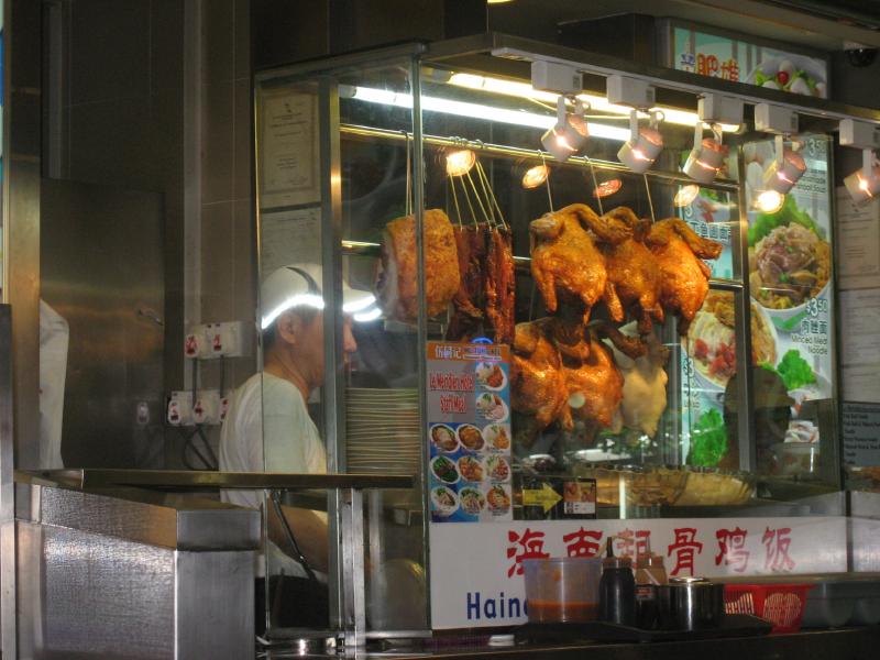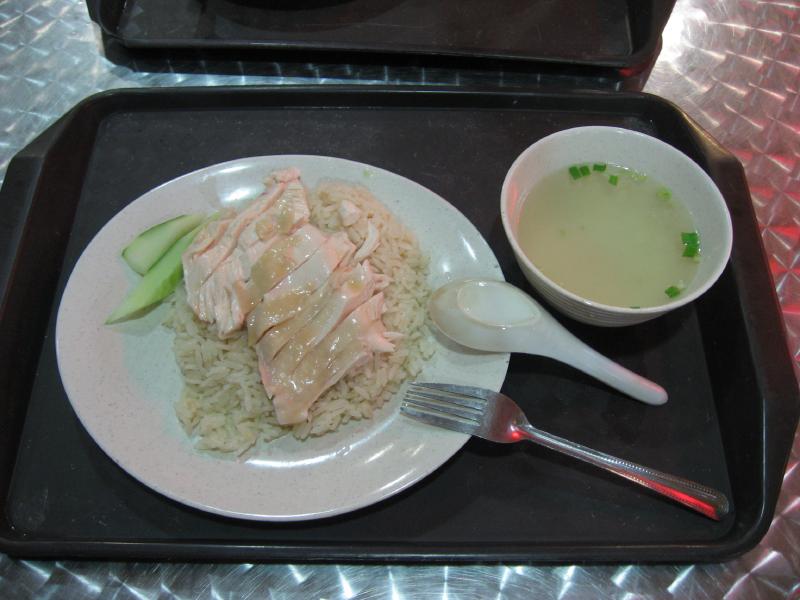 おなかいっぱいなので部屋に戻って少し食休み。1時間ほどのんびりして、そろそろ出かけましょうか。ショッピングモールを通り、地下鉄へ向かう途中にHMVがあった。せっかくなので中を見てみると日本のCDコーナーもあり、海外版として日本より安くなっているのもあるようだ。歌は同じなので、徳永英明やポルノグラフィティ、YUKIなどゲット(101.75$)。韓国や台湾のコーナーもあり、BOAは韓国コーナーにあった。地下鉄・シティホール駅に到着。例によってデポジットのいる地下鉄の切符を買い(@0.9$)、次のドービーゴート駅で降りる。ここは何度も来ているフードコートでチキンライスを食べるのが目的だ。途中、セブンイレブンやカルフールがあったので、いいものが何か無いか探してみる。ガイドブックに乗っていたマンゴーキャンデーはないかな・・・ないなあ。その代わりといっては何だが、カルフールでドライマンゴーをゲット(4.75$)。お土産にもできるかな、と思いまずは試しに一つ買ってみたが、これがなかなかの美味。台湾で買うものより酸味があり歯応えがいい感じ。これはまた後で買いに来ましょう。さて、メリディアンの下のフードコートに到着。かつて回転寿司のあったところやデザートコーナーがあったところが服売り場になっている。なんとか入口を探して入るが、前回来た時より随分と規模が縮小された感じ。ここは2003年にリニューアルされて随分キレイになったと思っていたのだが、今回は妙に古ぼけて寂れた感じになってしまっている。どうした?それでもざっと一周するとありました、チキンライスやさん。さっそく蒸したほうをゲットし、頂きましょう(@3.2$)。まずはこのスープを・・・さっぱりとして鶏の風味がよく出ていて、いいねえ。そしてチキンライス、これは肉が柔らかくてごはんもしっかり鶏の味がしみていて、期待通りおいしい。でもどうしてこんなにさびれてしまったのだろうか。次来た時もあるのかなあ・・・こんなことならリニューアルしなくても良かったのにね。