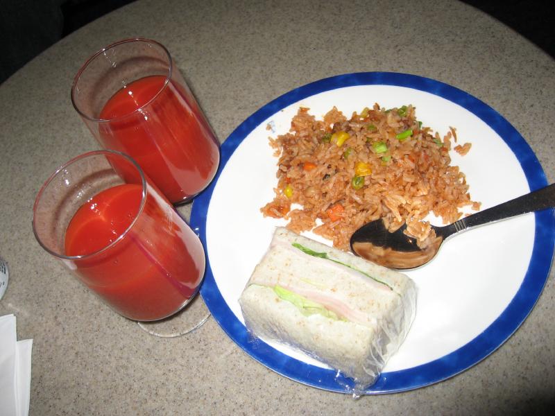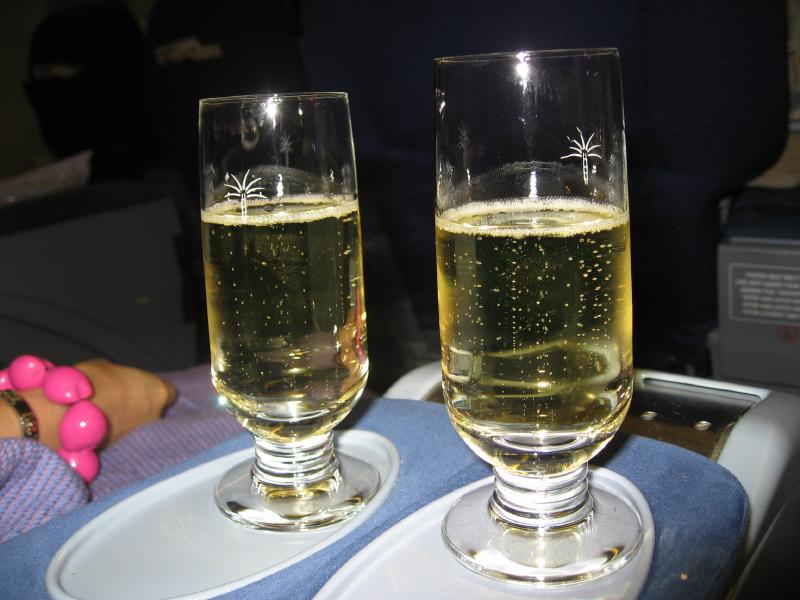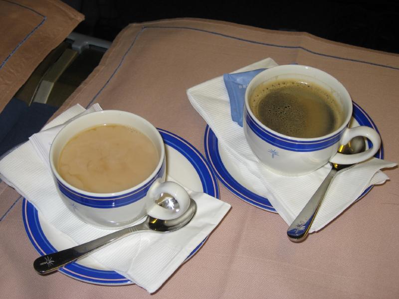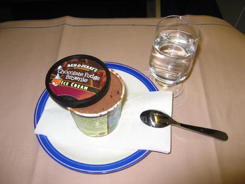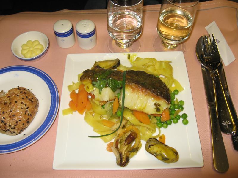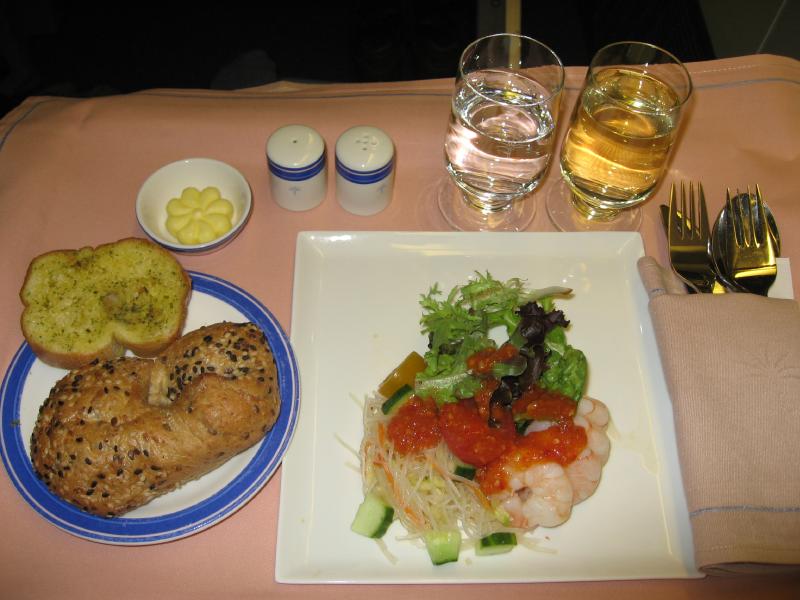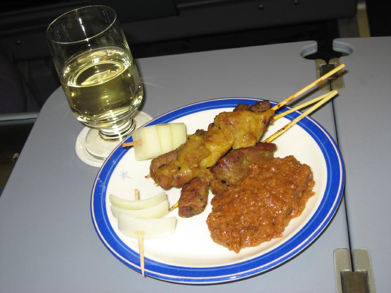 少し遠いが、ゲートに到着。もうすでに荷物チェックを受ける列ができているが、ビジネスクラス列からすぐに中に入ることができた。ゲート内には出発を待つ人がたくさんいるが、日本人はばらばらといる程度。インド系の人や、欧米系の人が多いかな。しばらくして、搭乗が始まった。さっそく中に入り、まずはウェルカムシャンパンを頂く。うーん、やっぱりビジネスクラスはやめられませんなあ。ほどなく飛行機は離陸し、そして再びサテーサービス。今回はチキンとラムからチョイスできるということで、羊嫌いならば当然のようにオールチキンだが、ここはやっぱり両方でしょう。白ワインと共においしく頂きました。そしてまもなくディナーが始まった。まずは前菜のエビのベトナム風。好みの前菜でおいしいのだが・・・辛いぞ。いや辛すぎるぞ。ベトナム風味で爽やかな感じはいいのだが、とにかくこの赤いソースが辛い。ガーリックトーストでなんとか辛味を抑えるが、それでも辛い。ちょっとこれは辛すぎませんか・・・その後メインには魚。タラのフィレとムール貝、野菜とヌードル。白ワインによくあう料理だ。この料理が辛くなくてよかった。まだ辛さの余韻があるけどね・・・それにしても、他の人はもう食べ終わっているのはどうして?もっとゆっくり行こうよ。デザートにはアイスクリーム。結構甘いがこれがまだ残っている辛い余韻をうまく抑えてくれて、ちょうどいいデザートでした。コーヒーもいろいろと選べるので、キリマンジャロを頂きましょう。ミルクティで辛味を抑えるのもいい。ふう、ごちそうさまでした。