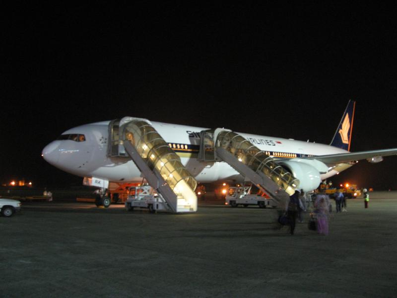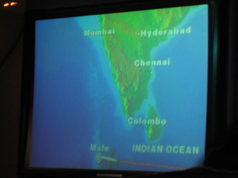 食後はゲームをしたり映画を観たりしながらのんびりと過ごす。しばらくして飛行モニター画面を見ると、いつのまにやらモルジブの近くまで来ていた。そしてモルジブ時間の22時、シンガポール時間では翌日1時になるが、マーレ国際空港に到着した。真っ暗なのでよく分からないが、思ったよりもずっと大きな空港だ。よく見ると遠くに首都マーレのある島がぼんやりと見えていて、たくさんの船が海に浮かんでいる。タラップをおり、入国審査へ。ここの入国審査といい、荷物がでてくるまでの時間といい、なんともいえない南国モード。特に荷物、こんなに遅いベルトで周ってくるのははじめてみたぞ。幸いすぐに出てきたから良かったが・・・税関を通り、晴れてモルジブの人となる。1987年の初海外旅行から20年、これで節目の60カ国達成だ。これからも少しずつ増やしていければいいな。