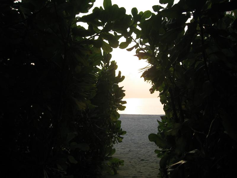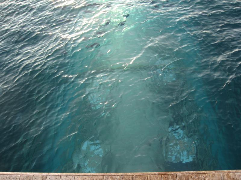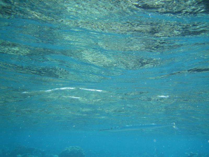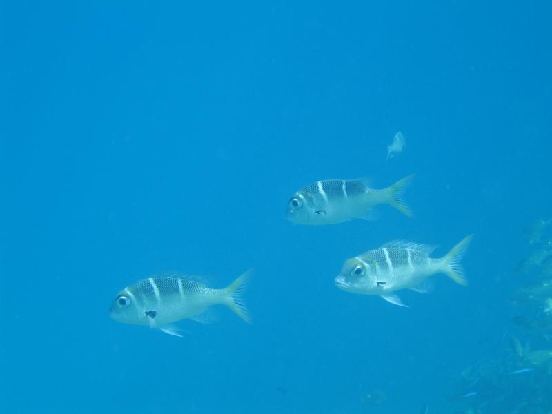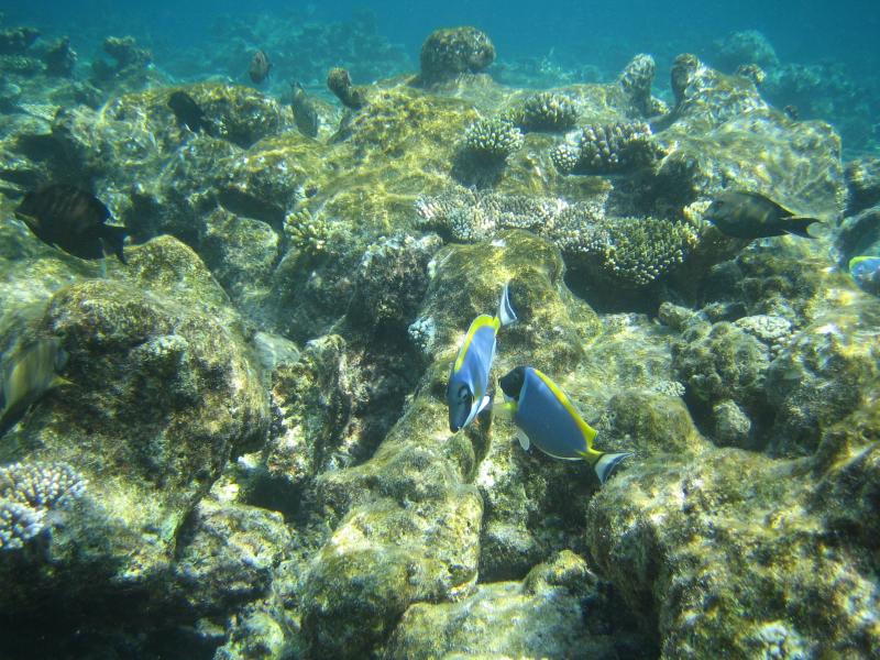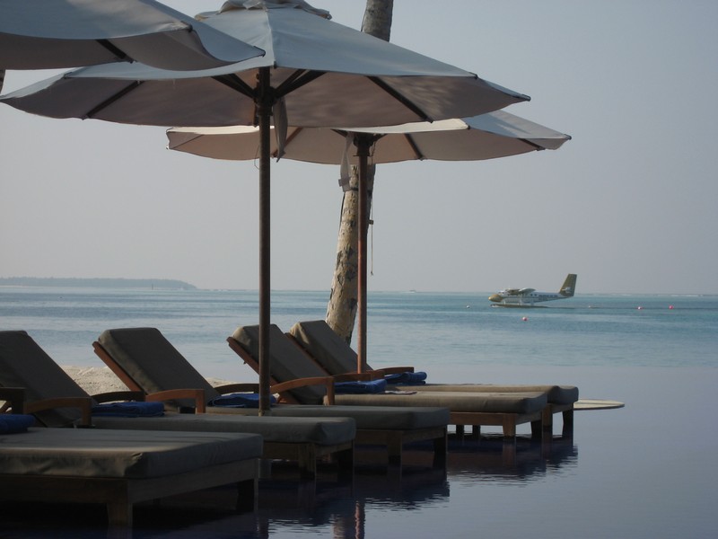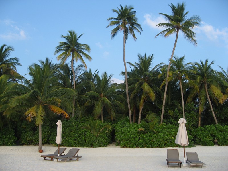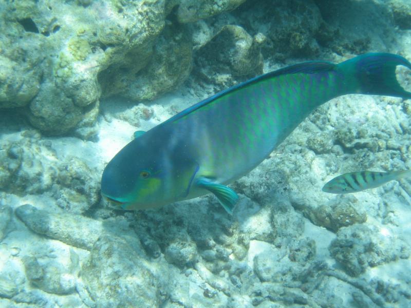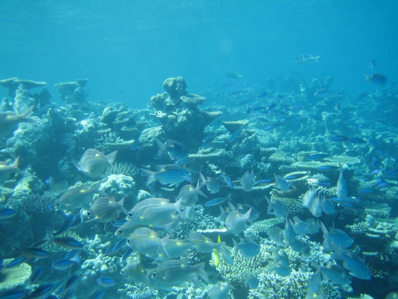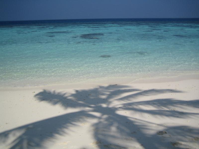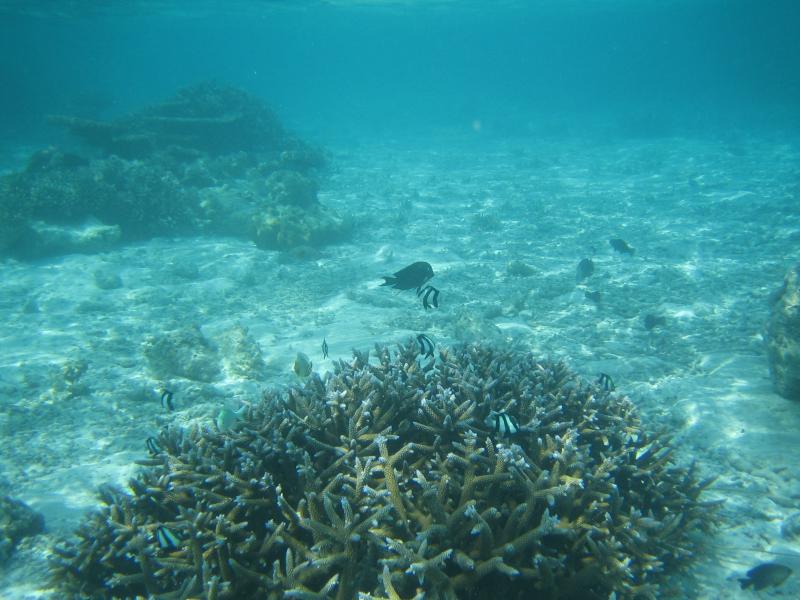 ちょうどパラソルのあるデッキチェアがあいていたのでそこをキープ。海に入る。白い砂が気持ちがいい。波打ち際にも魚の姿が見えるぞ。早速マスクとフィンをつけ、シュノーケリング開始。かなり遠浅で、砂浜がずっと続いている。このあたりにはぽつぽつと珊瑚があり、そこに魚がいろいろいるぞ。沖縄やグアムでも見るような白黒ストライプのスズメダイがたくさんいるが、この辺りでもかなり大きなチョウチョウウオやアオブダイがいるのがモルジブらしいのかな。もう少し沖へと行くと、一面に珊瑚が広がっている。この辺りでもかなり浅く、まだまだ十分に足が立つ。もう少し沖へと行くと、急に深くなりこの辺りがドロップオフだ。崖のような斜面には一面の珊瑚があり、そこはたくさんの魚たちの棲家。深さは10メートルくらいあるかな。天気がいいし、透明度も高いので底まできれいにみえるね。やはりこの辺りにくると、砂浜とは違った魚たちが群れをなして泳いでいる。おいしそうな魚もきれいな魚もいるね。たくさんの熱帯魚達の群れにしばし見とれる。せっかくなのでたくさん写真を撮ろう。何度も窒息しそうになりながら、できるかぎり深く潜って写真を撮る。耳抜きしないと耳が痛いぜ。