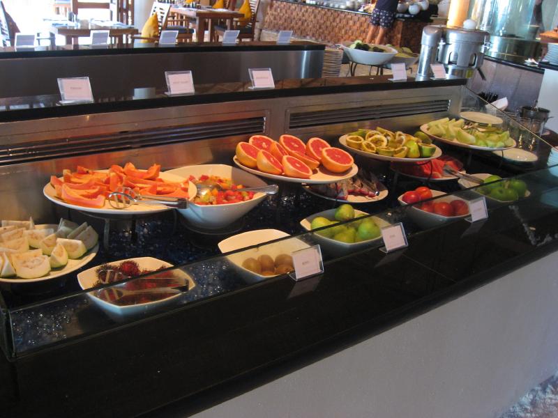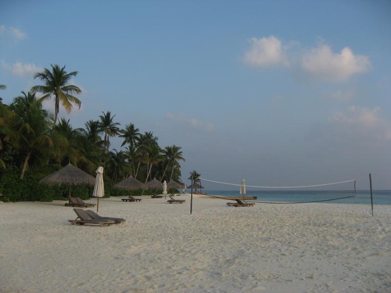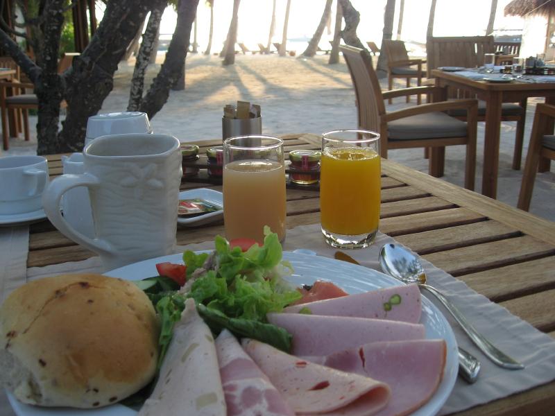 朝ごはんへ行きましょう。アトールマーケット(Atoll Market)は屋内も白い砂で敷き詰められている。朝日が気持ちいいので、外のテーブルにつきましょう。ビュッフェの広いスペースにはハムやサラダ、果物などがたくさん並んでいる。フレッシュなオレンジジュースをいただき、いろいろとたっぷりいただきましょう。ここは昼や夜はインディアンやイタリアン、グリルなどもあってさらに充実するらしい。ゆったり朝ごはんを楽しんでいると、モルジブ人のスタッフが気さくに声をかけてくれる。誰が教えたか、「そんなの関係ねえ」「おっぱっぴー」がお気に入りのようだが・・・