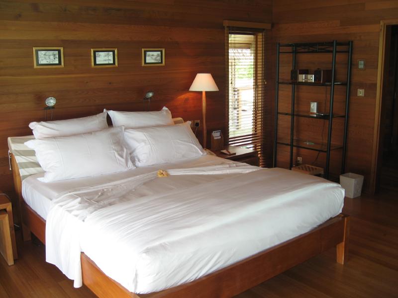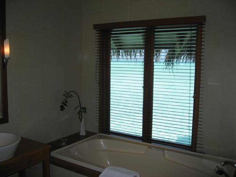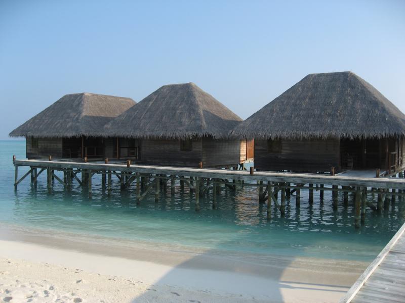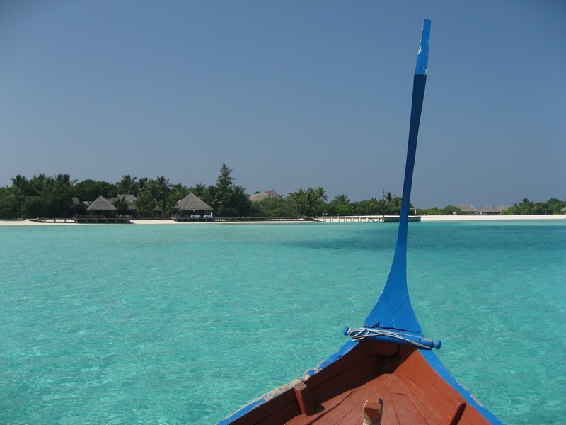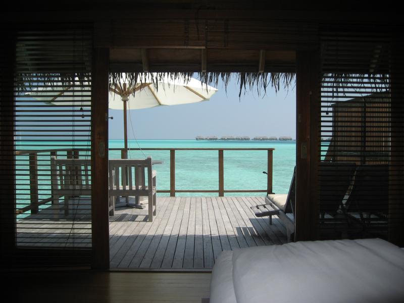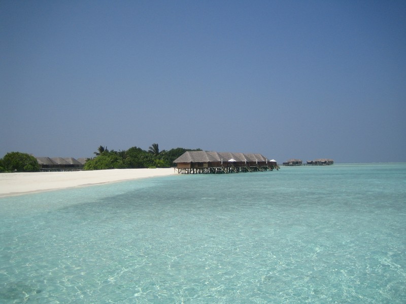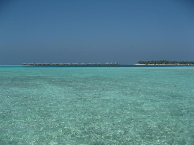 さて行きますか。ビーチビラに別れを告げ、水上コテージのある向かいの島にドーニで移動しようとしていたら、日本人スタッフのAyaさんが声をかけてきてくれて案内してくれた。ドーニはモルジブ独自の船で、静かな海を滑るように走る。5分ほどで向かいの島に到着。こちらはフロントのあるメインの島に比べると、少しこじんまりとして、静かにのんびりできそうだ。桟橋を渡り、白い砂の上を少し歩いていくと、10棟ほどの水上コテージが立ち並ぶところにやってきた。案内されたのは306号室、角部屋だ。中に入ると・・・すばらしい。部屋はビーチビラより少し狭くはなるが、それでもかなり広い部屋と広いベッド、そして部屋から一面に広がる青い海と青い空。遠くにメインの島が見え、パラソルとデッキチェアのある広いベランダからはそのまま海に入ることもできる。バスルームもゆったりとしていて、海を見ながらバスタイムを楽しむことができる。理由は分からないが、部屋を移ることができて本当にラッキーだ。こんな贅沢、いいのかな・・・