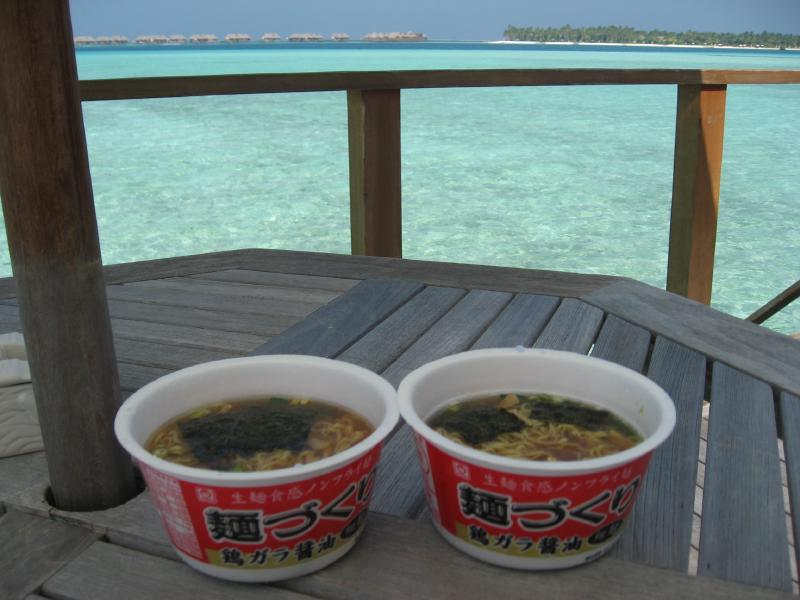何度も潜って疲れたな。そろそろ戻りましょうか。波打ち際で遊ぶさーちゃんのところに戻り、海を見ながらのあんドーナツタイム。海辺で甘いもの、いいねえ。ふう、面白かった。部屋に戻りますか。お腹が空いたので、ここは日本から持参のカップラーメン。お湯は部屋で沸かせるしね。海遊びのあと、青い海を見ながらのラーメンはまさに至福のひととき。実にうまいねえ。さて、シャワーを浴びますか。窓から青い海を見ながらブルガリのアメニティを楽しむバスタイム、なんて気持ちがいいんだ。ビーチビラもよかったが、水上コテージは海の見える開放感でなんとも気持ちがいい。ごきげんなバスタイムをすごして、さっぱりしたぞ。