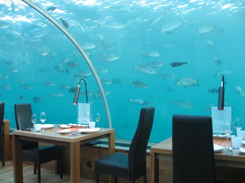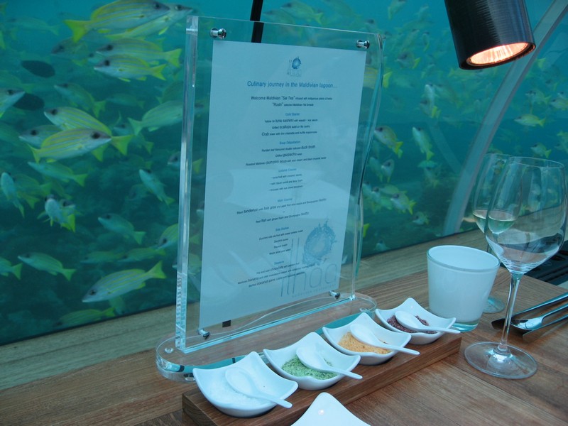 水中レストラン・イターは水深6メートルにあり、2005年にオープン。世界初の水中レストランとして世界的にも有名なところだ。ここはモルジブを象徴するところの一つとして是非とも来てみたかった所で、このホテルを選んだ決め手にもなったところだ。まだ日が落ちていない時間帯なので明るく日が差し、たくさんの魚が泳いでいるのが見える。見通しがいいように一番奥のテーブルにつく。空いているテーブルもあるが、もう一組予約していた日本人は来ないのかな?