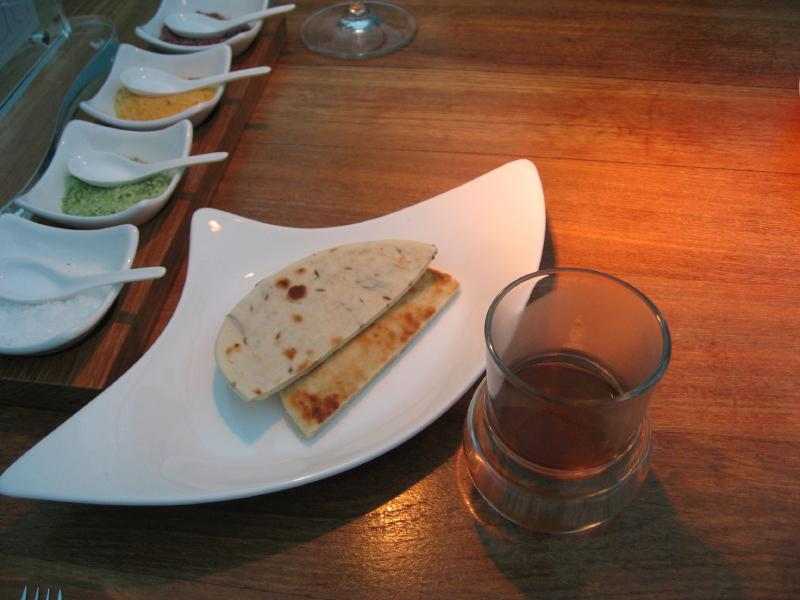 さて、ワインはどうしようか。妙に巨大なワインリストを見ると、想像通りではあるがなんとも高い。一番安いのがアルザスのゲベルツ、それが80ドルかあ・・・でも一番安いのもなんなので、ロワールのサンセールにしましょう。120ドルだがやむをえない、今日は無礼講。まずはモルジブのお茶「Sai」を頂く。少し甘みがあり、ハーブの香りがするおいしいお茶だ。次に「Roshi」というモルジブの平たいパンがでてきた。ココナツやカレー、バナナやプレーンなどいろいろな種類がある。シンプルで、それぞれにおいしいぞ。サンセールとともに、これから始まるディナーを待つ。