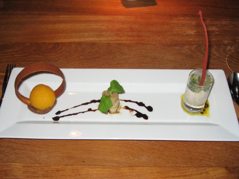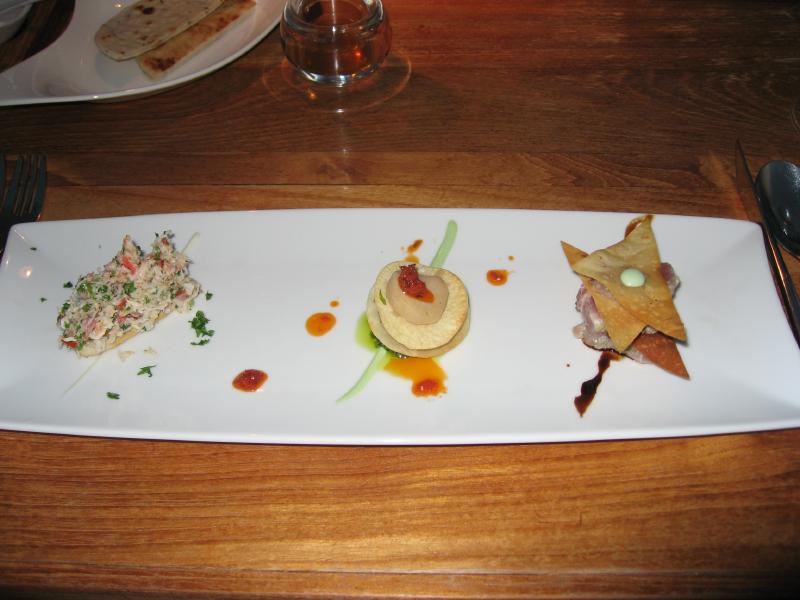 まずは前菜。カニ・ホタテ・マグロをそれぞれきれいな一口サイズにアレンジしたものがでてきた。どれも上品で、白ワインにあう味だ。ゆっくりと味わいながらいただく。この中では特にマグロがおいしかったかな。続いてはスープ。モルジブのカボチャスープは少しコクがあり、甘すぎずほっくりとした味わい。ガスパチョは少し辛味があり、野菜の歯応えが残っていて好みの味。そしてカモのスープ、これが絶品。カモの味わいがしっかりと出ていて、それでいてサッパリとしていて、付け合せのパルミジャーノとあわせると更なる美味。これはいいねえ。量も多過ぎず、いろんな種類が食べられて、ちょうどいいです。そしてロブスターコース。シンプルに蒸したものとココナツソース、ドライトマトとムースにしたもの、そして不思議な食感の、柔らかいラビオリ。かわったロブスターのコースにワインも進みます。