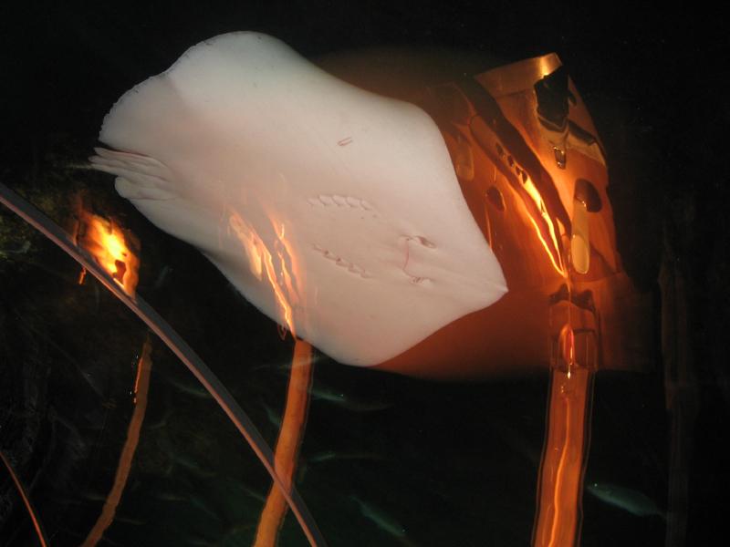 外はもう夜になっている。でもライトアップをしているので、たくさんの魚が行きかうのが見える。そしていつの間にやら、大きなエイがやってきた。昨日見たマンタもそうだが、光に集まるのかな。大きなエイがガラス面に添うように行ったり来たりをくり返している。見ていて飽きないね。