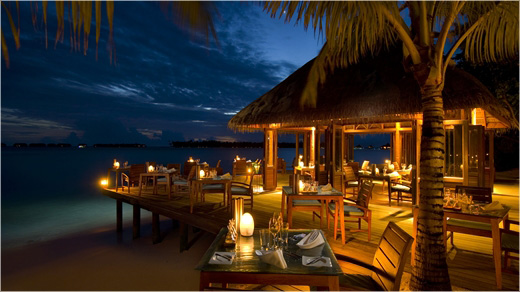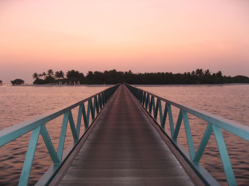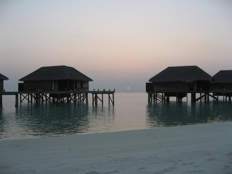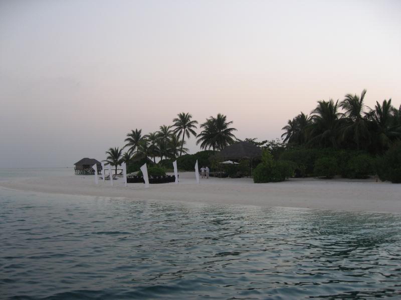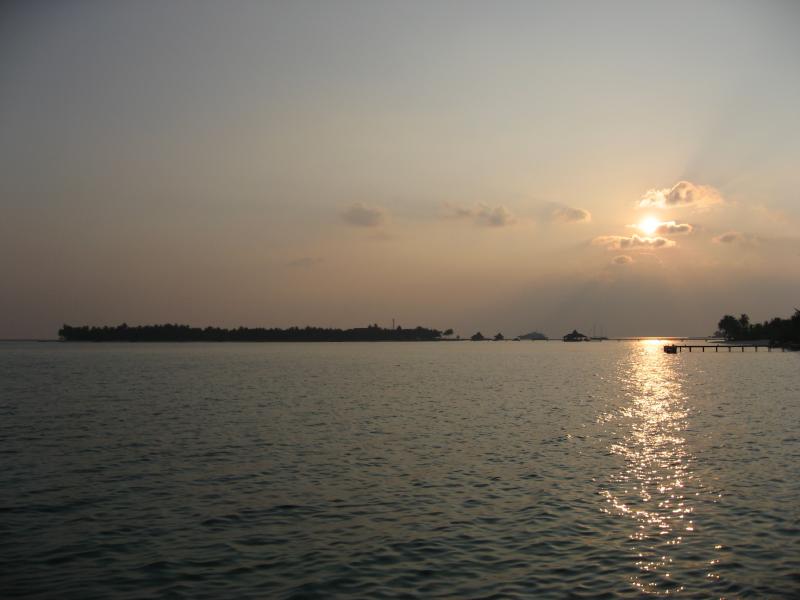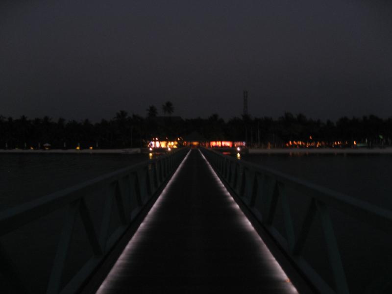 メイン島へとつながる橋を渡ろう。橋の中ほどには水上飛行機の発着所があるのだが、ちょうどコンラッド専用機が到着したところ。今からここで過ごす人達が降りてきた。ほんの2日前にここについたのに、明日はこの飛行機で帰るのか・・・残り少ない時間を楽しみましょう。メイン島へと渡り、暗くなったビーチのデッキチェアでしばらく海を見ながらのんびり過ごす。今日は少し風が強いが、寒くもなくちょうどいい感じだ。ランガリバーやアトールマーケットはそろそろ賑わいだす頃かな。そろそろコテージ島に戻りましょうか。ドーニにのって、真っ暗な海を渡ろう。