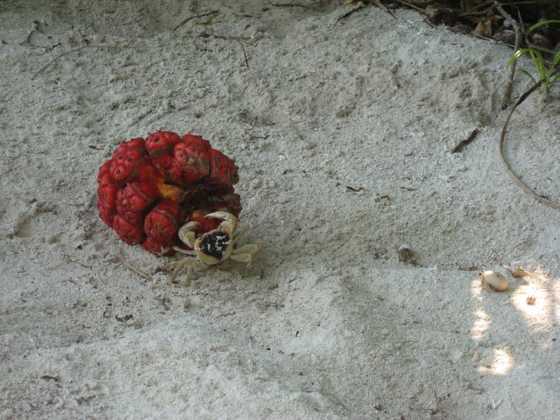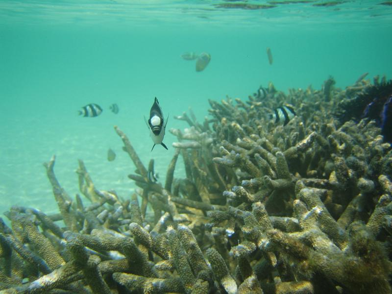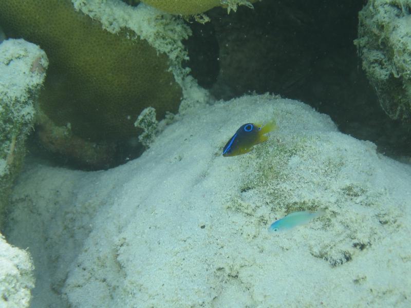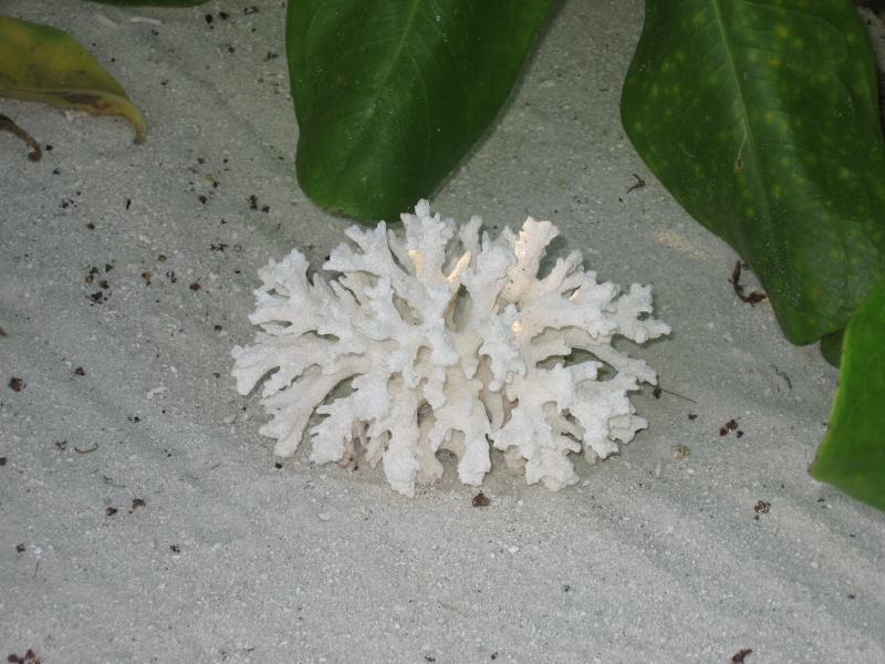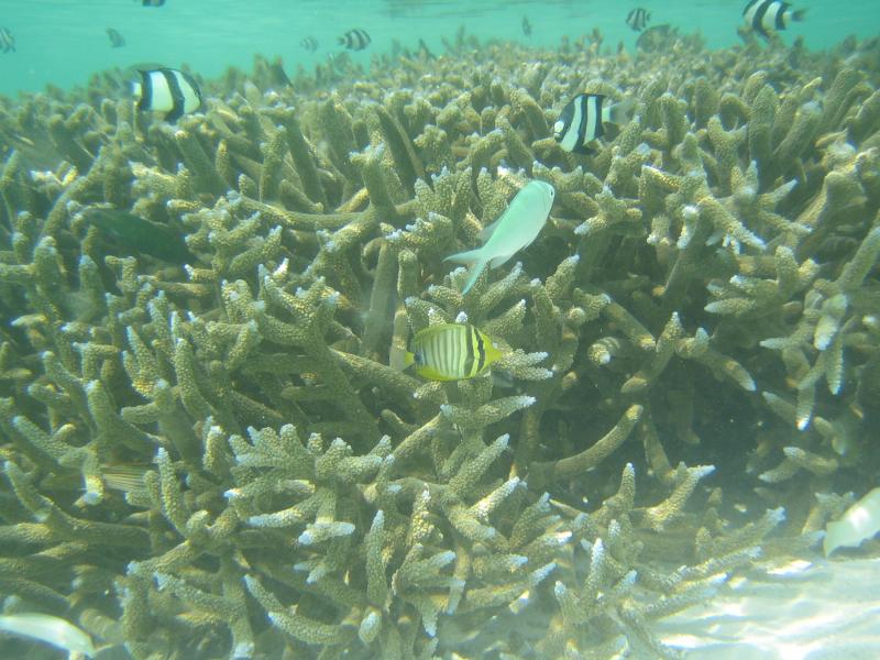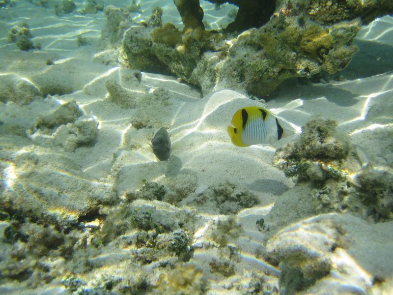 部屋をでて少し歩くともう反対側の海。本当に小さな島だ。海に入ると・・・サンゴだらけ。同じように砂浜なのだが、いろいろな大きさのサンゴがそこら中にある。そしてサンゴがあれば、そこに住む熱帯魚がたくさんいるのだ。ずっと遠浅なので魚の種類に変化はあまり無いが、それでもこれだけたくさんいると楽しいな。スズメダイやチョウチョウウオの仲間がいろいろといて、楽しい一時を過ごす。