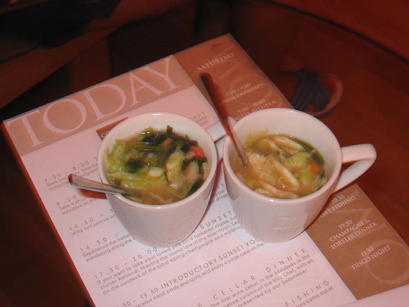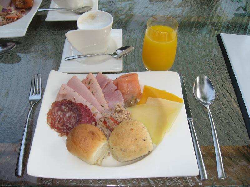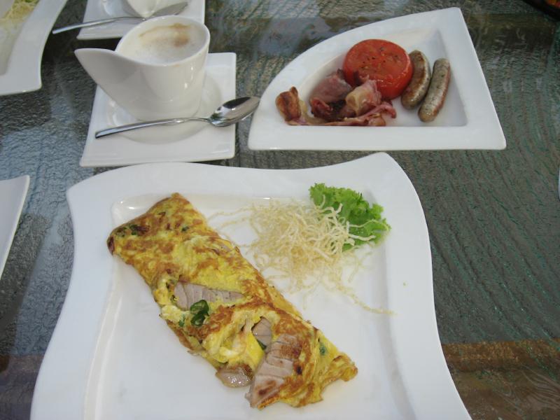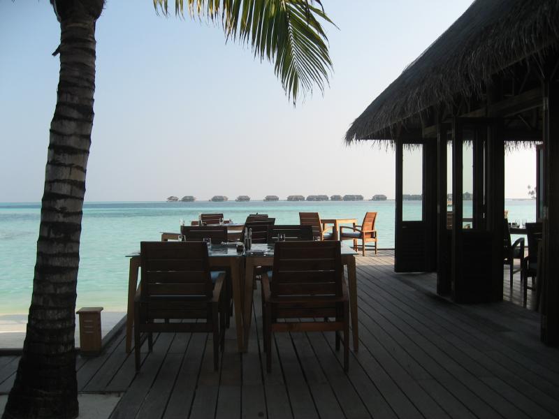 今日の朝ごはんはヴィル(Vilu)レストランで食べよう。水上コテージ島にあるレストランだ。昨日行ったアトールに比べるとこじんまりしているが、その分静かでのんびりした感じ。いつものようにハムやチーズなどをたっぷり食べよう。あと絞りたてのオレンジジュースも忘れずにね。海を見ながらゆったり食べる朝ごはん、いいねえ。ツナのようなものがあり、これがなかなかおいしい。のんびり食べていると、レストランの人がメニューを持ってきた。どうやらここは温かい料理はオーダー制のようだ。さて、どうしようか。卵やソーセージなどいろいろとあるな。そんなにたくさんは頼めないのでモルジブのカレーとオムレツ、ソーセージなどをオーダー。しばらくすると出てきました、思ったよりは大きなお皿でたっぷりと出てきました。やっぱりね。モルジブのカレーはそれほど辛くはないが、やっぱりカレーなかなかおいしい。オムレツはリーフフィッシュ入りと書いてあったので、その辺を泳いでいる魚かなあ。これもなかなかおいしいです。