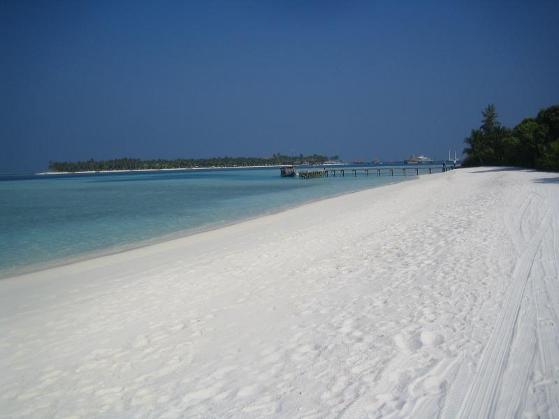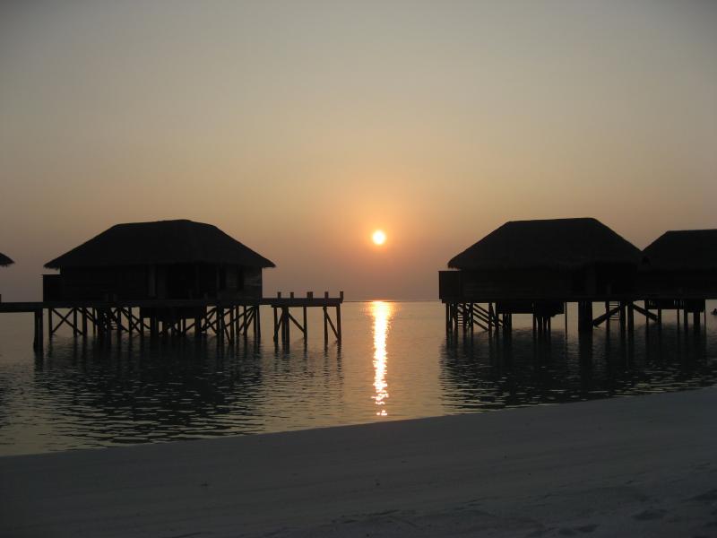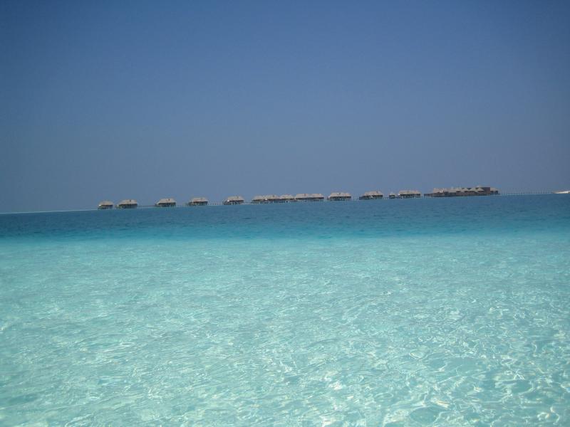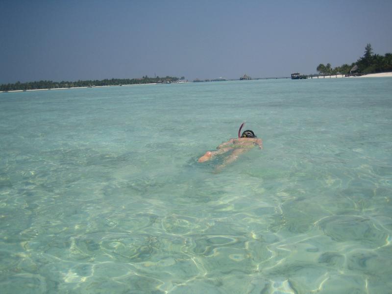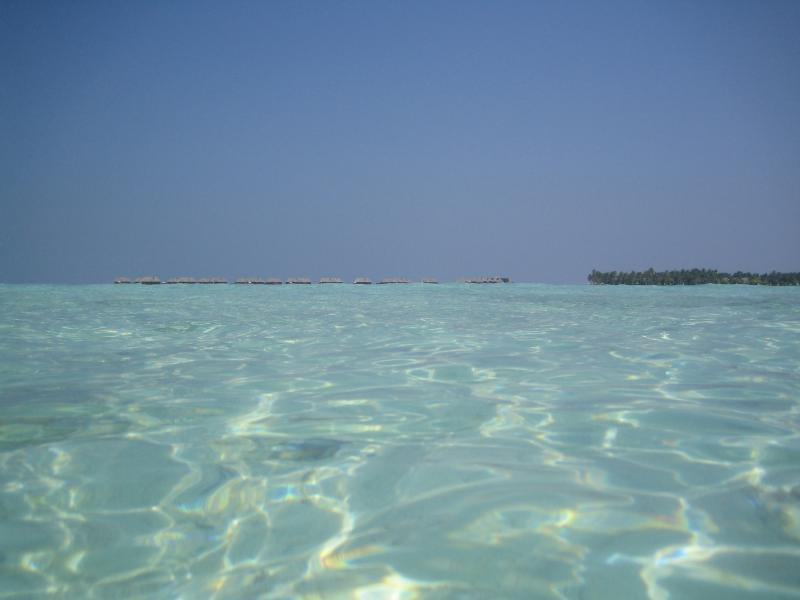 部屋に戻って一休み。今日は水上コテージでのんびりしましょうか。隣のコテージからは、ドイツ人ファミリーの楽しげな声が聞こえてくる。さあて、われわれもそろそろ海に入りましょうか。部屋からベランダにでて、木の階段を降りるとそこは海。雲ひとつ無い青い空に包まれながら、穏やかな海に身を任せると自分の体が自然の中に溶け込んでいるような不思議な感覚だ。遠浅の海で、のんびりシュノーケリングを楽しむ。このあたりは砂浜が広がっており、サンゴはほとんどない。そのせいかあまり魚はいないなあ。メイン島と丁度真ん中辺りから海の色が変わっているので、そこまで行って見ようか。ひたすら遠浅の海を泳いでいくが、一面の白い砂浜。これはこれできれいだが、やっぱり魚がいて欲しいなあ。海の色が変わるところは、ぐっと深くなるところ。でも単に砂浜が深くなっているだけで、昨日のようなサンゴ満載のドロップオフではない。うーん、ここまで来たが戻りましょうか。コテージ前に戻り、しばらく海と戯れる。