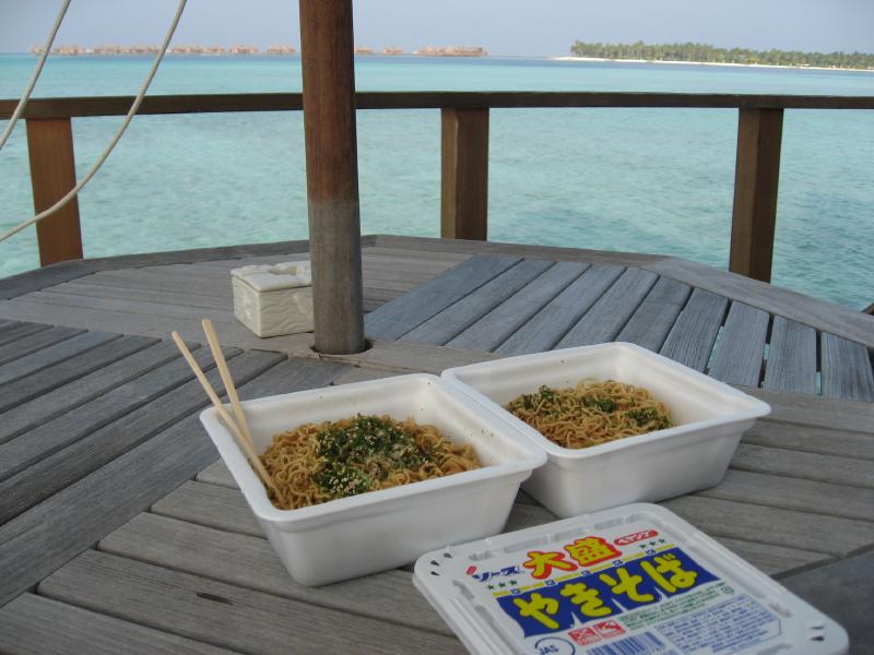 海から上がる。明日の夕方にはここを発つので、海に入るのはもうおしまい。なんだか寂しくなるね。白い砂浜を歩いて部屋に戻り、海を見ながらのシャワータイム。何度も言うが、気持ちがいいなあ。ほっと一息落ち着いたところで、小腹がへったぞ。海のあとといえばやっぱり焼きそば、ここはぺヤングでしょう。昨日のラーメンに続き、ベランダで海を見ながらの至福の一時。大盛りなので食べ応えもあるしね。冷えた麦茶を飲みながら、ゆったりした午後のひとときを楽しむ。これで日本から持ってきたインスタント系は、すべて終了。