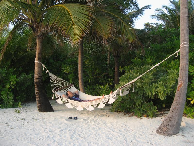 そろそろ夕方。夕日をみたいので、散歩に行きますか。さっき泳いだ辺りから見ると太陽はかなり傾いている。しばらく歩くとハンモックのあるところに出てきた。こういうしっかりしたハンモックは初めてだな。乗るのに少しコツはいるが、少しゆらゆらした感じが心地よい。さて、太陽がオレンジ色に変わってきたぞ。砂浜に座り、日没を眺める。眩しかった太陽はいつの間にか深い赤に変わり、そして水平線の少し上あたりで吸い込まれるように消えていった。明日の夕方にはここを出るので、もうこの夕日をみることはないと思うとなんだか本当に寂しくなってきた。でもまだ丸一日近くあるので楽しまないと。