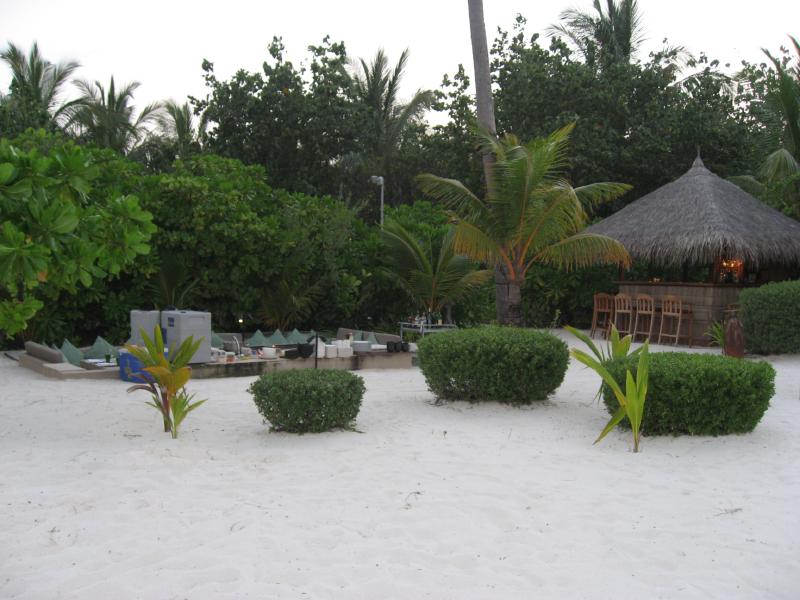 さて、散歩を再開。水上コテージへとつながって行く道を抜けるとメイン島が見える砂浜に出てきた。ここにはココグリル(KokoGrill)というレストランがある。砂浜を少し掘って作ったところにテーブルとグリルがあり、鉄板焼きなどのコースが楽しめるようだ。またコンラッドに来れたらここも着てみたいかな。その先の砂浜にはプライベートビーチダイニングがある。てっきりハネムーンとかのカップル用かと思っていたら、今日は10人くらいのディナーが行われるらしく、テーブルのセッティングがされていた。大人数でこれたらこんなのも楽しそうだね。