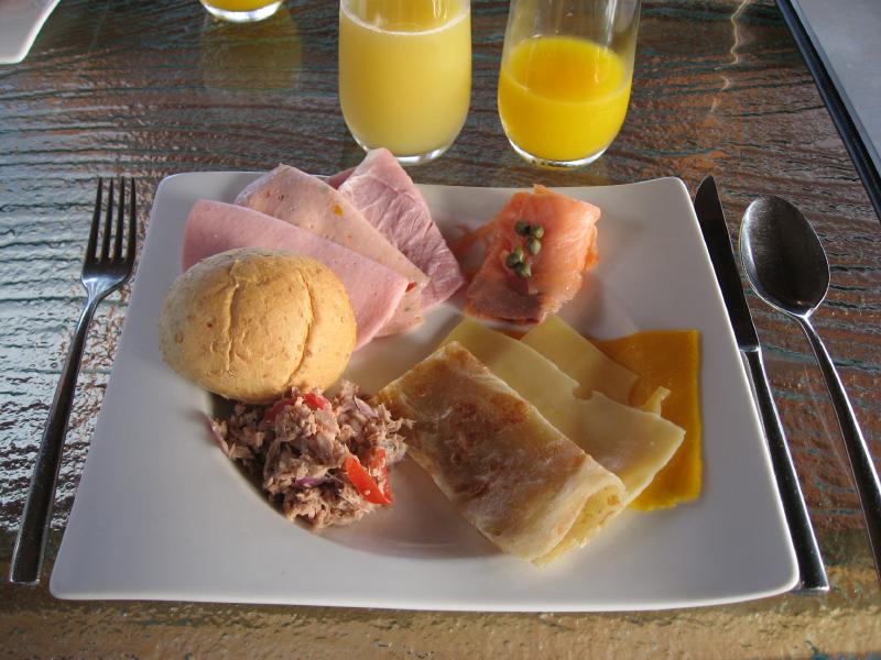 目が覚めた。なんだかいつものようには明るくない気がして外をみたら、曇っていた。たまにはそんな日もあるかな、と思いベランダにでると、なんと明け方に結構まとまった雨が降ったようで、外に干していたフィンなどのダイビング機材が少し濡れてしまったな。夜明け前に星はきれいに見えたのに、そのあと急に天気が悪くなったんだね。さて、シャワーを浴びて朝ごはんへと行きますか。曇っているせいで、海の色がいつもよりは青くは無い。それでも雨が上がってよかったな。モルジブ最後の朝ごはんは昨日と同じヴィルレストランでいただく。冷たいものはいつも通り少しずつたっぷり選び、温かい料理はオーダー。モルジブカレーは昨日とは異なり、インスタントラーメンのような麺が一緒についてきた。なんだか不思議な感じだな。野菜のフライ、のようなメニューがあったので頼んでみたら春巻きが登場。揚げたてでおいしいが、5本は多いなあ。