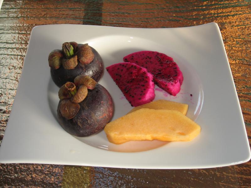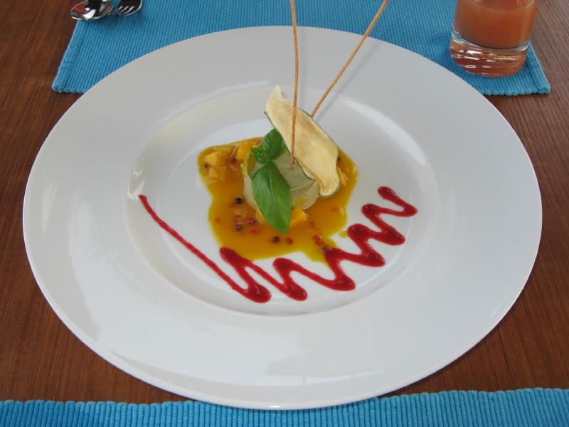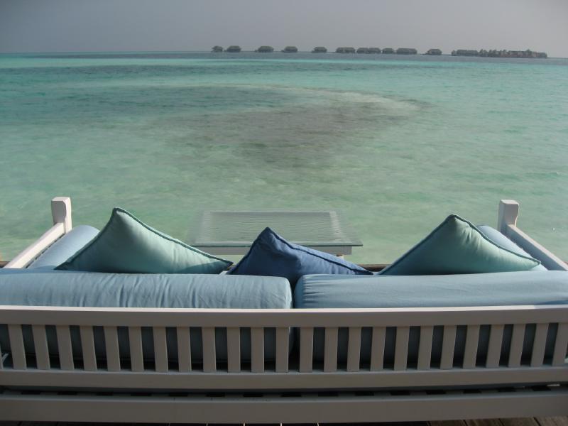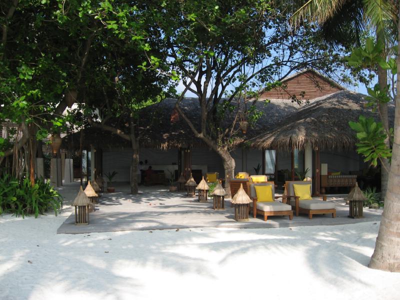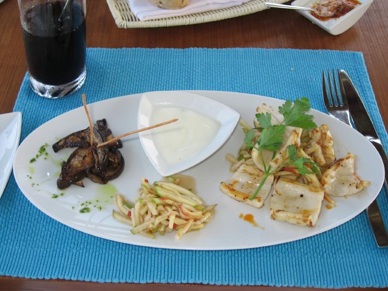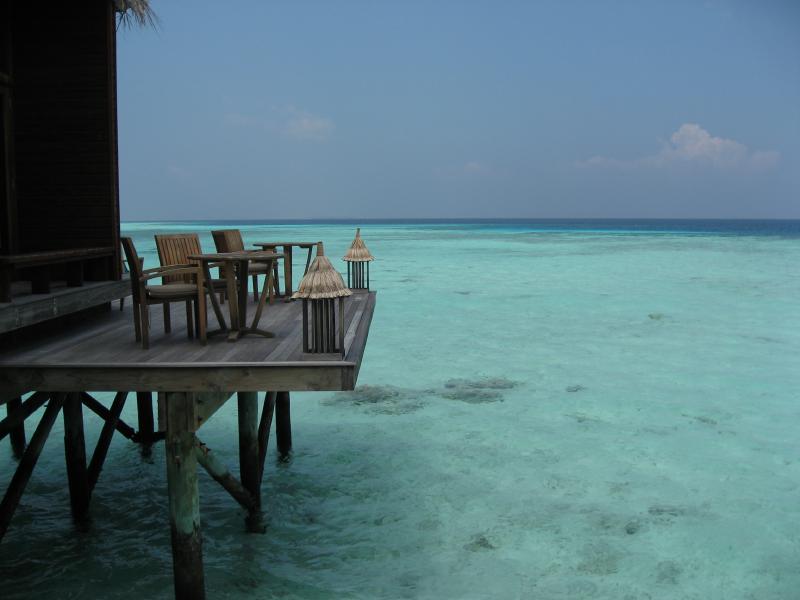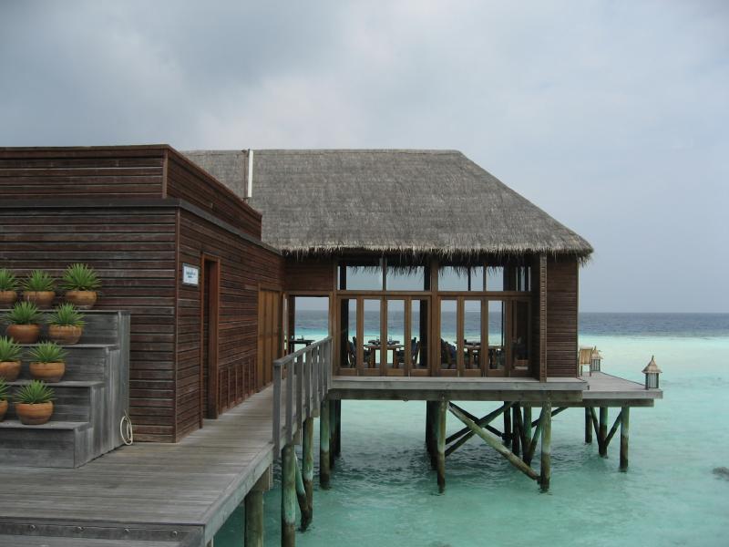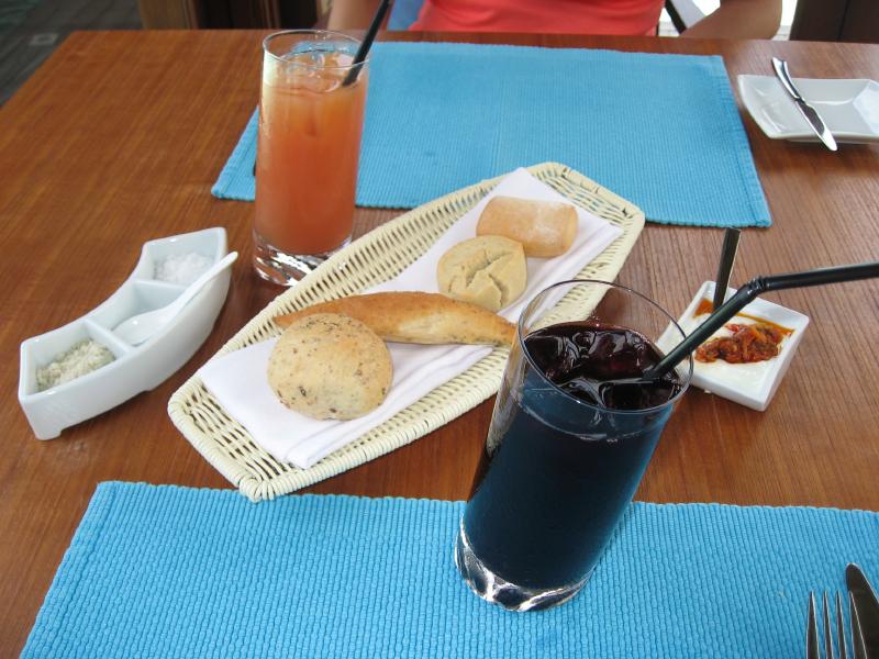 お昼にしましょうか。まだ行ってないところというわけで、スパエリアにあるマンドゥー(Mandhoo)レストランに行こう。念のためにフロントで予約がいるかどうかを聞いてみると、別にいらないし遠いのでバギーで送ってくれるとのこと。それはありがたい、ということでフロントでしばし待つ。数分して、バギー到着。荷物などを積んで砂浜も走れる頼もしいヤツだ。早速のりこみ、メイン島の真ん中の道を走る。初日にスパに行ったときに歩いた道だが、やはりバギーだと早い。あっという間にビーチを過ぎ、スパエリアに到着。レストランに入ると、お客さんはパラパラといるくらいだ。さて、何にしましょうか。ここはスパに併設のレストランということで、気・火・地・水をテーマにした体にいいメニューがたくさんある。ちょっと分かりにくいのだが、日本語メニューがあったのでじっくり選びましょう・・・選んだのは火をテーマとしたイカの料理と、水をテーマとした魚の料理。飲み物は、アルコールではなくグレープフルーツとブルーベリーのフレッシュフルーツジュースにしましょうか。ジュースのあとにはすぐ4種類のパンが出てきた。どれも歯応えがよく、おいしいぞ。しばらくして料理登場。これはメニューではハーフサイズなのだが、十分だね。うん、どちらも素材をキッチリと生かした料理で、バランスよく健康にいい感じだ。なによりおいしいしね。夜でゆっくり時間があれば、もう一皿別のものを食べてもいいかな。食後のデザートに緑茶のパンナコッタをいただきましょう。あっさりしていておいしい。テーブルから見える海は穏やかで、ずっと遠くまで見渡せる。ごちそうさまでした。