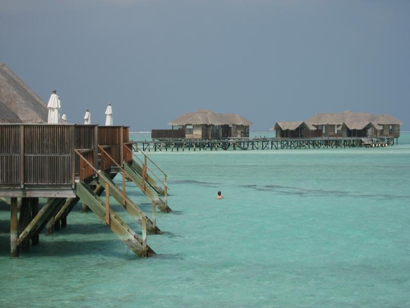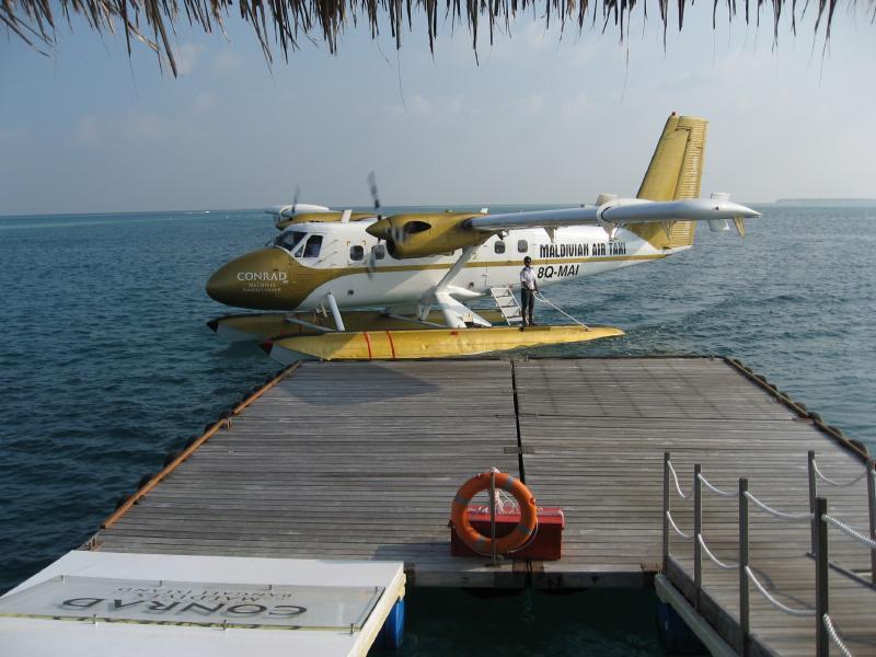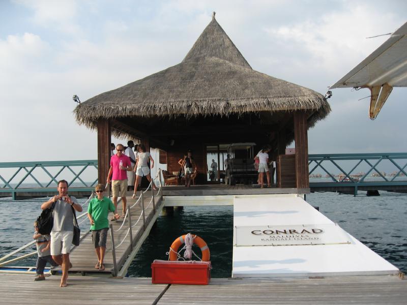 レストランを出て、ビーチをのんびり歩きながらフロントまで帰ってきた。もうそろそろ時間なのでチェックアウトしましょうか。なぜかいつも使っているカードは認識してくれなかったので別のカードで支払う。宿泊やレストラン、往復の水上飛行機、マーレでの宿泊すべて含めてしめて4260ドル。予約時はヒルトン価格だし、短期間とはいえ年末年始のコンラッドということを考えるとありえない金額に抑えることができた。これで水上コテージも泊まれたしね・・・本当にラッキーでした。いよいよ出発の時。橋を渡って水上飛行機の発着所へと向かう。このきれいな海ともとうとうお別れだ。明日からもずっと穏やかな日々が続くんだろうな。発着所に着いてしばらくすると、ドイツ人のファミリーがここで仲良くなっただろう別の家族との別れを惜しみながら、赤い水上飛行機で飛び立っていった。