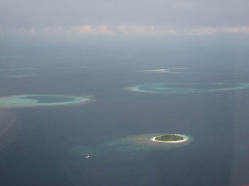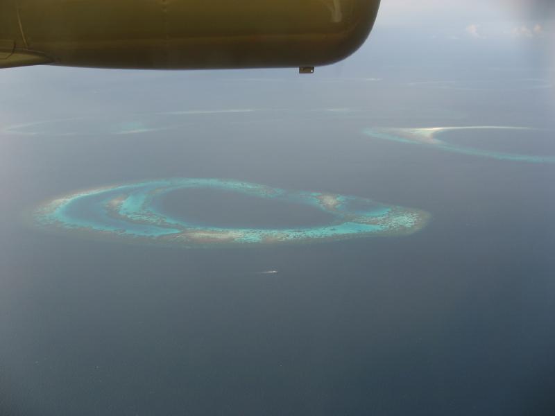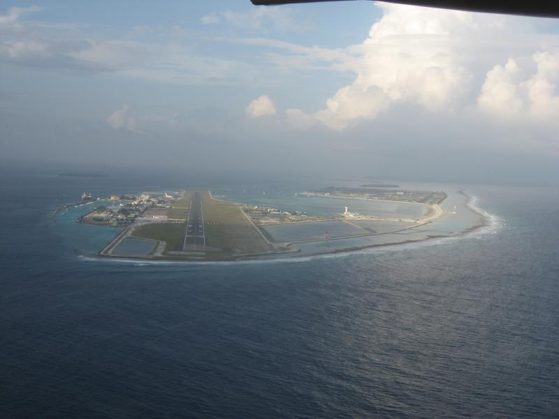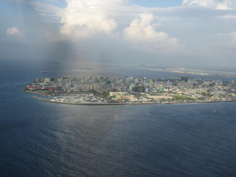 水上飛行機は少し沖にでて、一気に離水した。今朝までいた水上コテージや、さっきまでいたレストランが眼下に見える。それにしても夢のような時間だった。また来れるかな・・・水平飛行となり、一面に広がる青い海のなかに小さな島や環礁が見える。行きと同じ景色だが、今日は少し雲があるせいかなんとなく霞んで見える。それでも水平線まで広がる青がとてもきれいだ。30分ほどして、首都マーレの島が見えてきた。狭い島に7万人もの人が住んでいるという超過密都市、たくさんのカラフルなビルが立ち並んでいるのが見える。サッカースタジアムもあるね。マーレ島を過ぎるとすぐに空港のあるフルレ島。滑走路がよく見える。水上飛行機は高度を下げていき、フルレ島の沖に着水した。そのまま海上を進んで発着所に到着。空港まで戻ってきたぞ。