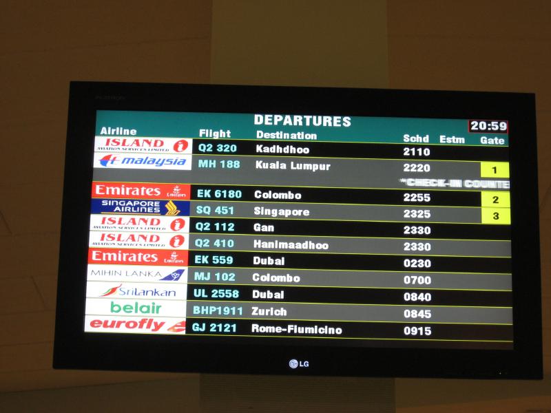 出国手続きをすませ、出発ロビーへ。中に入ると以外に広く、ゆったりしている。お土産やさんもいくつかあり、会社用のチョコレートや袋にたっぷり入った紅茶など、いろいろある。ばらまきお土産はシンガポールかなと思っていたが、これならばOK、買いましょう。これならばホテルやマーレで買わなくても、空港で十分だなあ。でも一度来て見ないと分からないよね。次からは、空港で。