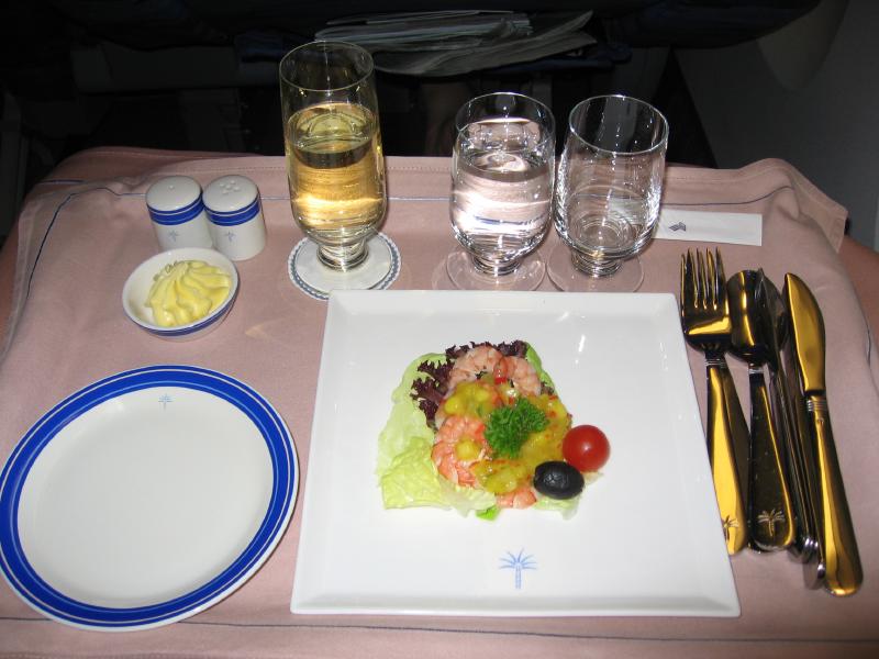搭乗が始まった。席につくと、まずはシャンパンサービス。やっぱりビジネスクラスはいいなあ。おつまみももらったが、今はいいのでこれはもって帰りましょう。シャンパンを飲み終えたところでそろそろ出発。離陸すると、昼間はあんなにきれいに見えた海が、今はほとんど何も見えない。ようく見るとポツポツと灯りが見えるところがあるが、あれはどこかのリゾートだろうか。それとも人が住んでいる島かな。モルジブ、本当にいいところでした。また来れたらいいな。