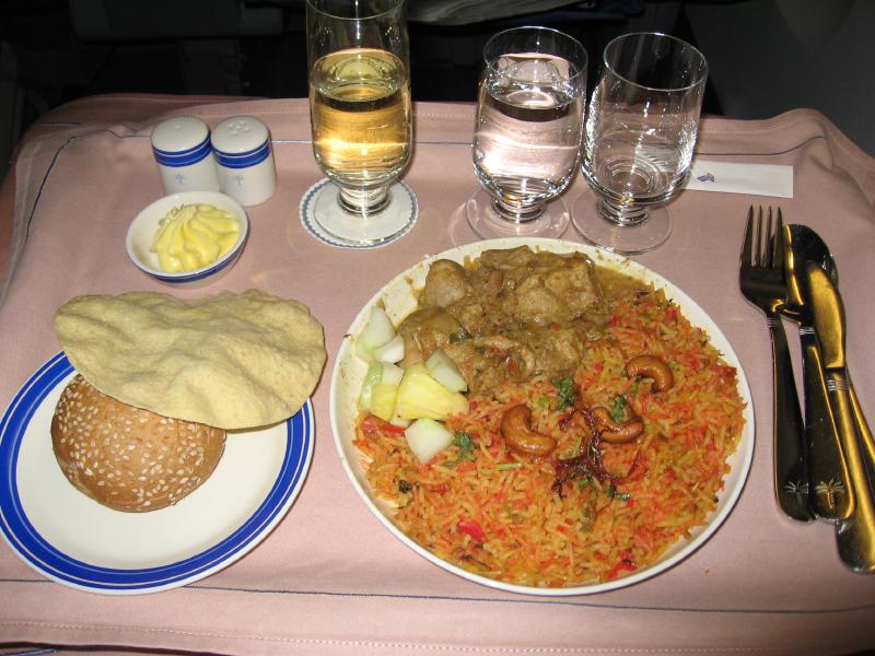 そしばらくして、機内食が始まった。夜中のフライトなので、食べずに寝る人も結構いるようだ。でもせっかくなのでいただきましょう。まずはエビとマンゴーのサラダ。これは行きのベトナム風のような激辛ではなく、白ワインとあうおいしい味。メインはチキンカレー。これが・・・辛い。カレーも辛いが赤いごはんがもっと辛い。おいしいが、夜中にここまで辛いものはきついなあ。半分くらいは食べたが満腹感と睡魔とでもう無理。食後にはミルクティーで口の中をまろやかにして、ようやく落ち着いたかな。シンガポール-マーレ線はお国柄か、辛い機内食にご注意を。