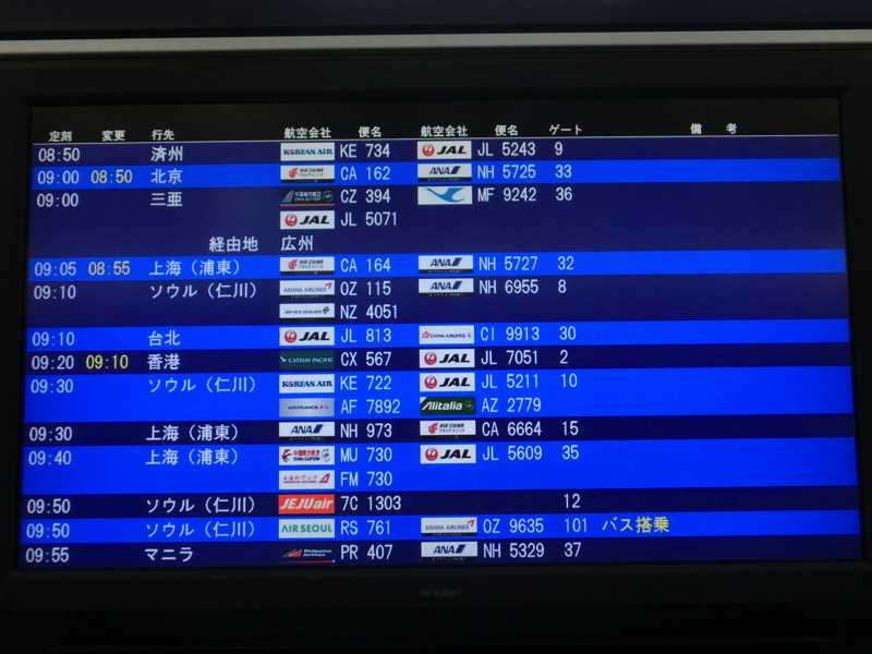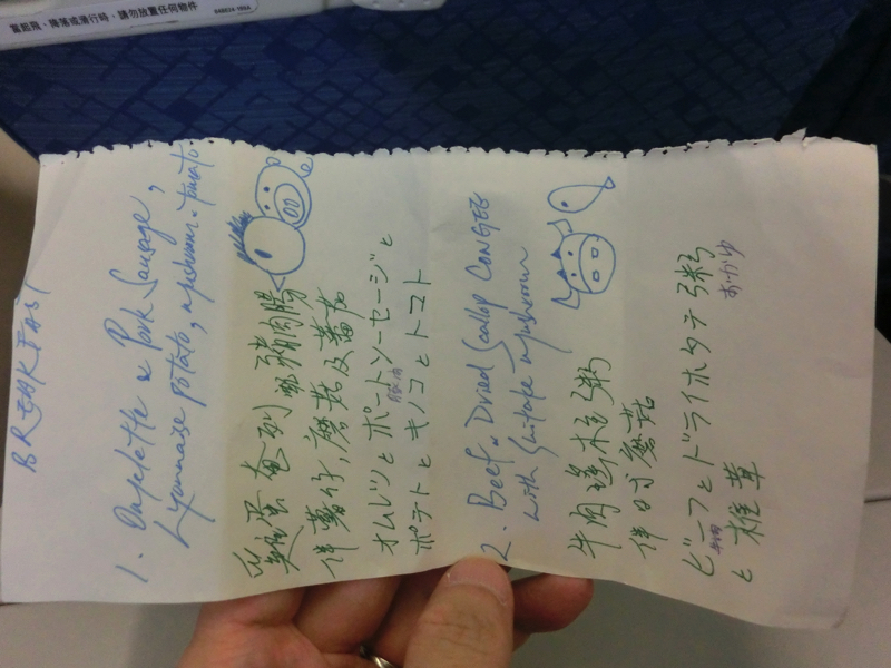 搭乗開始。ほぼ満席になり、いつのまにか熟睡の中を離陸、雲の上に出た。どうやらドリンクサービスは寝ているうちにあったようで、続いては機内食。カートが来て配られる時にメニューが渡されたが、これがまさかの手書きメモ。微妙な日本語が汚い字で書いてあり、それと衝撃の絵。まあ、鶏か豚か牛か魚かはわかるからこれで通じるよね。魚というかホタテだけどね。牛肉とホタテのおかゆを選ぶと、たっぷりしいたけの旨味のきいた意外とおいしいおかゆ。フルーツにヨーグルトもあり。朝にはちょうどいいくらい。