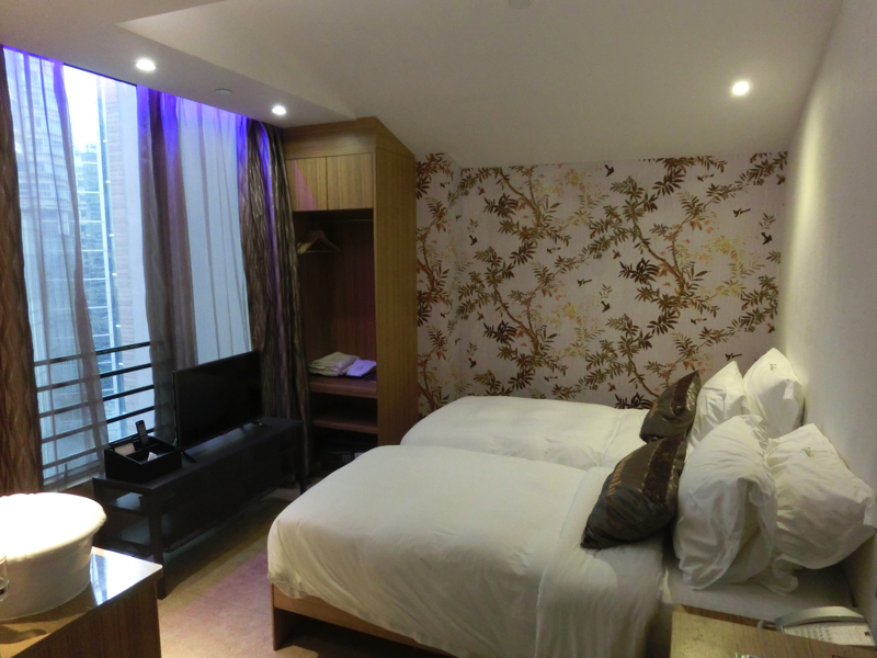 しばらく走ると、建物の間から香港島のビル群が見えた。そんなに雨は強くなさそうだし、観光客もそれなりに歩いているので後で行ってみよう。最初に着いたのが尖沙咀の東駅、あとから思えばここで降りてもよかったかも。このあとは徐々に離れていきそうなので、エンパイヤホテル前で降りる。ここから地図によると数分程度で着きそうだが、こんなタイミングで雨が強くなってきた。なんてこったい、でも頑張る・・・ちょっと迷いながら、目的のホテル、ハーバーホテルに到着。かなり濡れてしまったかな。チェックインして部屋に入ると、ゆったりと気持ちよさそうだ。テレビをつけると、なんと台風情報。そういうことか、珍しくタイミングが悪いな。部屋はかなり湿度が高く、大理石の床が濡れているぞ。気をつけないと滑りそうだ。