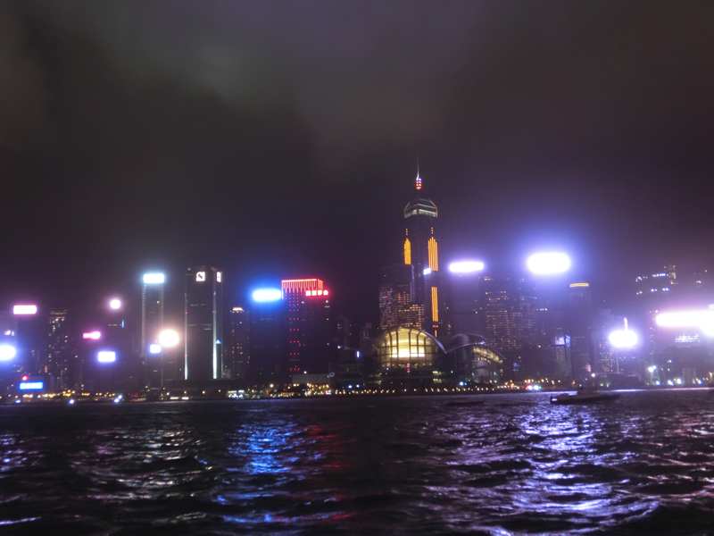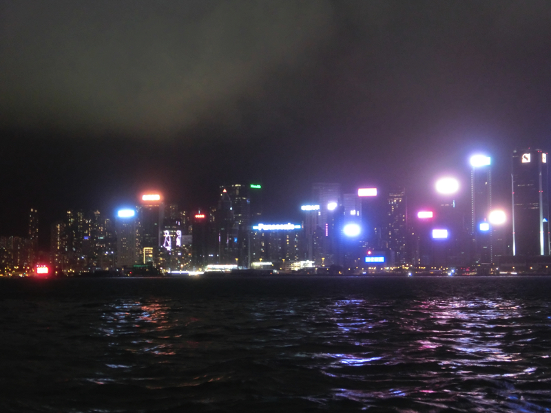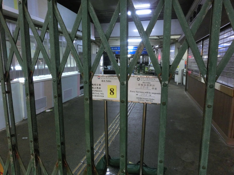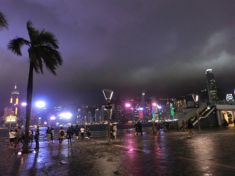 暗くなってきた。ではそろそろ出かけますか。もう一度ビクトリア湾へと行こう。雨も風も大丈夫そうかな。夜景はどんより雲とか関係ないので、これはきれいだ。ちょっと小雨なので少しぼやけて見えるが、それもまたいい感じだ。いろんなアングルで写真を撮ってみるが、そういえば湾を渡るスターフェリーがいない。乗り場まで来てみると、今日は台風のために運休だったのね。明日乗れたらいいけどなあ。