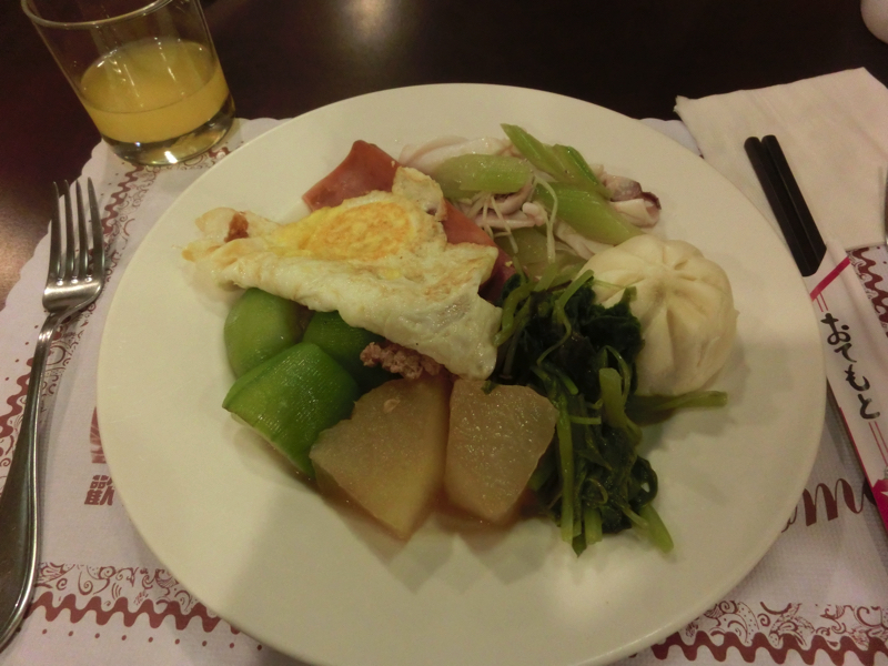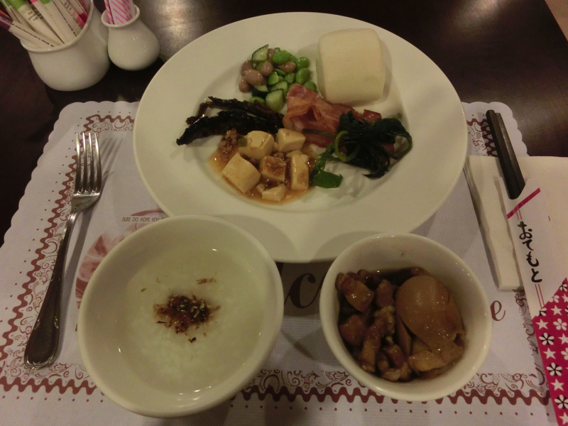 2日目の朝、昨日に続いてホテルのバイキング。昨日よりは1時間ほど遅いタイミングで行ったところ、お客さんも少ないしおかずもあまりないしで、これはちょっと寂しいなあ。一応、台湾風のおかずはいくつかあったのでそれをいただき、あまり時間もないのでこれで終了。昨日しっかり食べたしまあいいか。でもまだ8時過ぎだよ、もうちょっとおかずがあってもいいのにね。