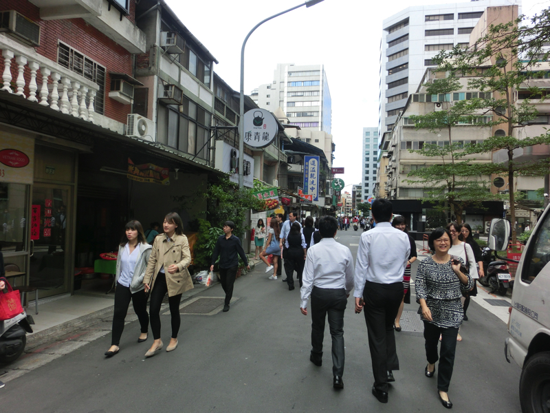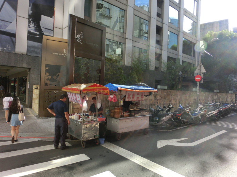 朝はホテルのバイキング。台湾風のおかずがいろいろとあり、なかなかの充実ぶり。野菜系が多いのがうれしいところ。でもジュースはいまいちかな。その分甘いスイカをいただき、満腹です。朝の栄養補給はばっちりだ。食後にホテルのまわりを散策。ちょっとした屋台が出ていたり、おしゃれなカフェがあったり、台湾らしいごはんやさんがあったり、昨日の夜とは異なりたくさんのお店がありました。さて、準備して、会社へと向かいましょう。