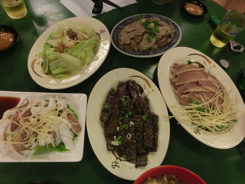 夜はタクシーに乗って数分ほど、地元で人気のアヒル料理のお店へ。お店の入り口には、アヒルのいろんな部位が並んでいました。肉のスライスをショウガといただくのがまずは定番、そして昼に続いて血を固めたものにレバー、どっちも意外と癖もなくあっさりいただけますねえ。今日は鉄分をずいぶんとっているようだ。あとは野菜、少しだけ海鮮ということでイカ、台湾では炭水化物を最初に食べるとのことでビーフンなど。こんだけ食べれば満腹です。ビールは一般的な台湾ビールはもちろん、生で18日しか販売できないという地元限定ビール、そして小麦ビール。あれ、ビールとは小麦では?なんでも一般的な台湾ビールは小麦のほかにお米が使われているらしく、少しさっぱりした味わいになっている。小麦ビールは小麦のみなので、しっかりと小麦風味が感じられる。とはいえ、こちらが本来のビールだけどね。