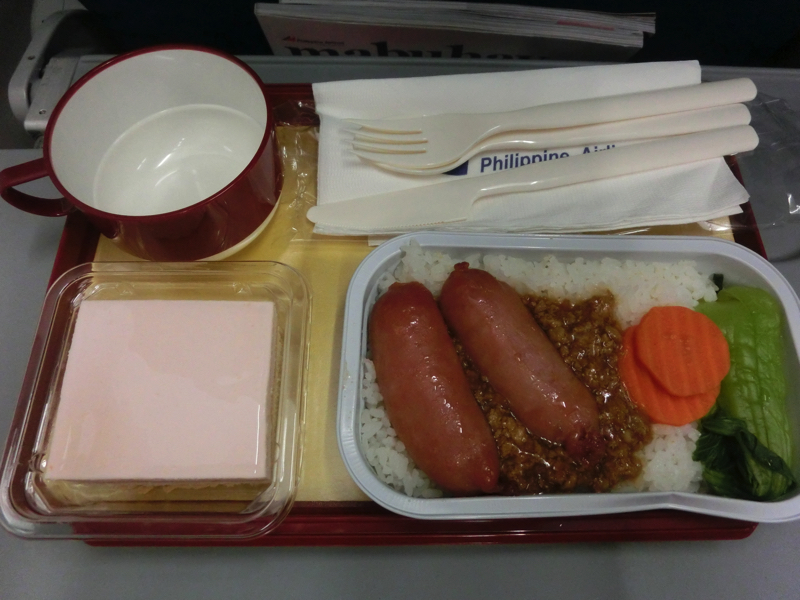 そろそろ搭乗時間。ゲートへと行くと、すでに行列ができていました。でもよく見ると、大阪からのトランジット客の行列のようで、まずその人たちを乗せたいようだ。でも後からばらばら集まってくるので、この人たちを優先するのはなんだろう?ようやく機内へと入り、窓際の席でほっと一息。ほぼ満席に近いようだ。離陸後、しばらくして機内食開始。あれ?ドリンクは?一緒に来るならいいが、先に機内食だけどんどんと配られて、もう食べ終ってからのドリンクでした。機内食はタイワニーズソーセージかチキンパスタかの選択。微妙な感じだが、チキンパスタもどうかと思うのでここはタイワニーズ。想像通りなのは台湾風の香り漂うソーセージ、想像外だったのはそれがオンザライスだったこと。まあ、おいしくいただきましたよ。後からゲットしたビールを楽しみながら、そろそろマニラに到着だ。